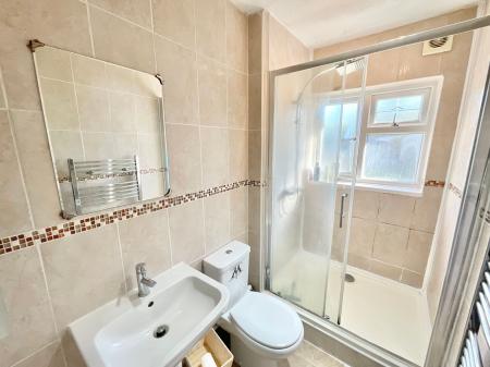 - Three spacious bedrooms including two doubles, one single, and a shower room with floor-to-ceiling tiling, a shower, sink, and W/C.