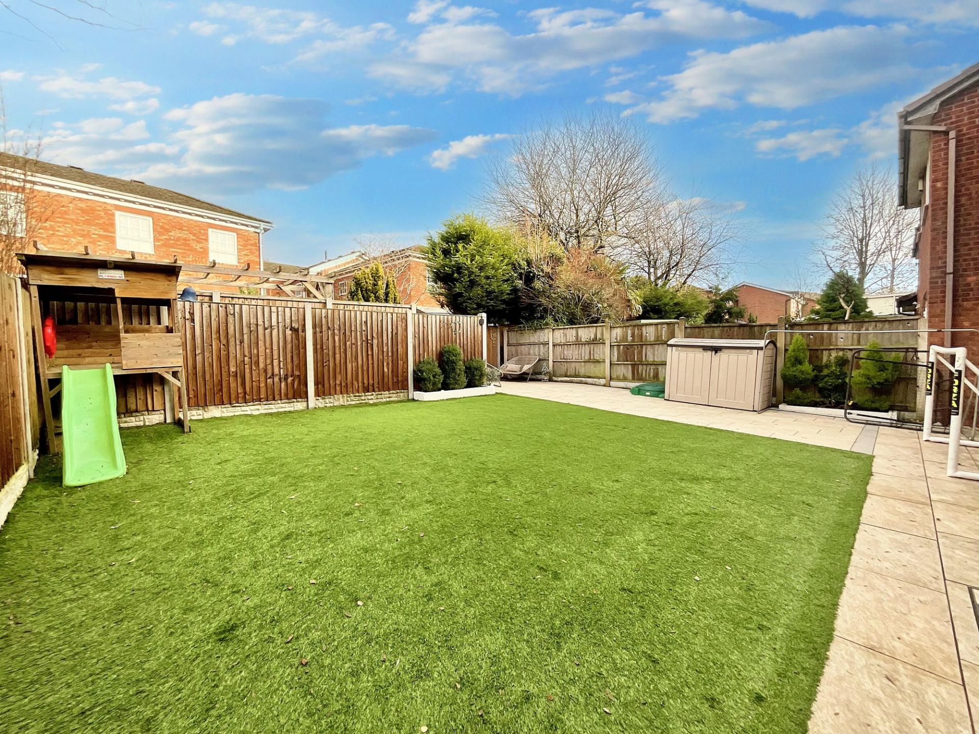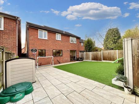 - Low-maintenance landscaped rear garden offering ample patio seating space and an artificial lawn. To the front, a lush grass lawn, driveway with off-road parking, and single garage.