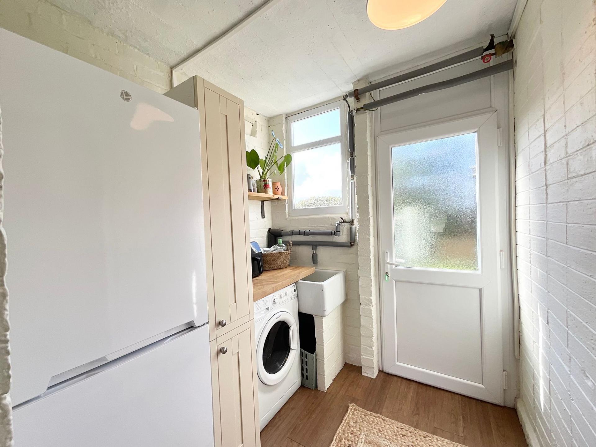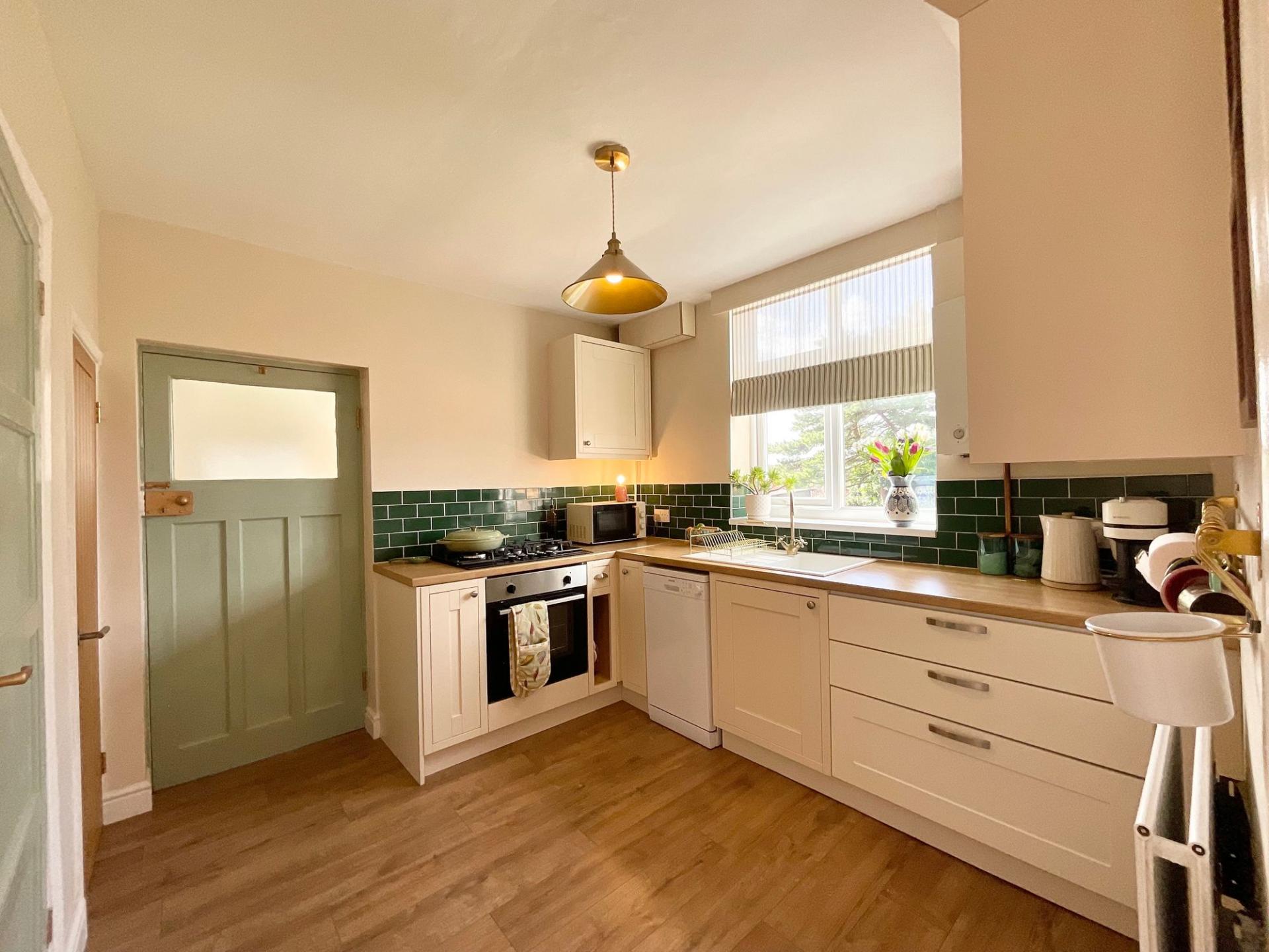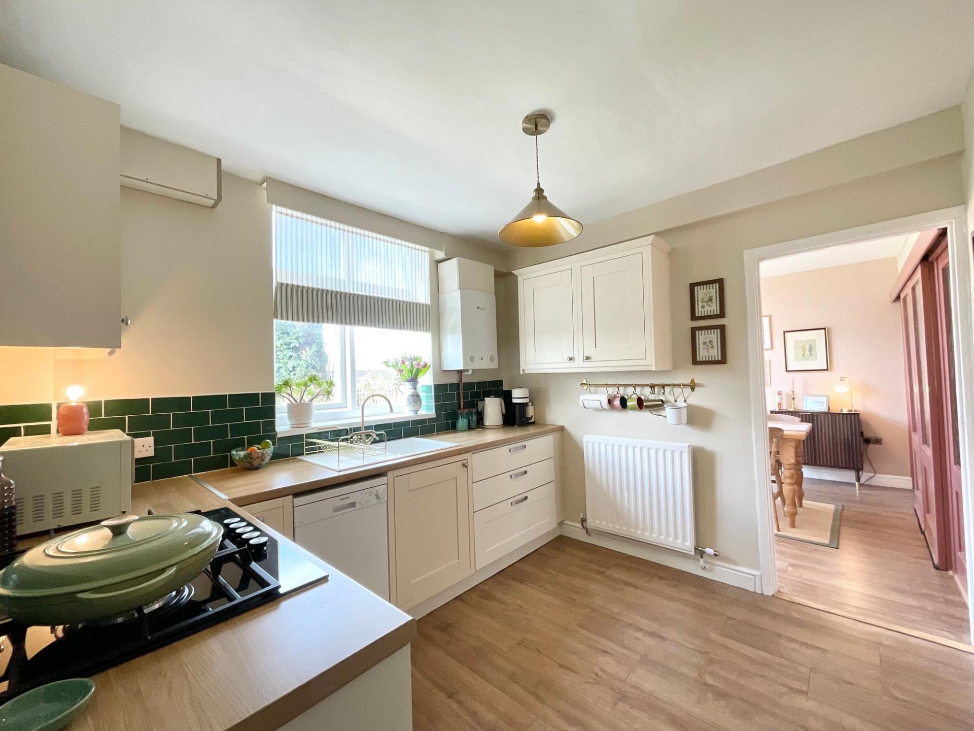 - Modern cream kitchen with wood-grain worktops, oven, 5-burner gas hob, plus utility room and downstairs WC. Upstairs: 3 bedrooms, shower room with corner walk-in shower, vanity and WC.