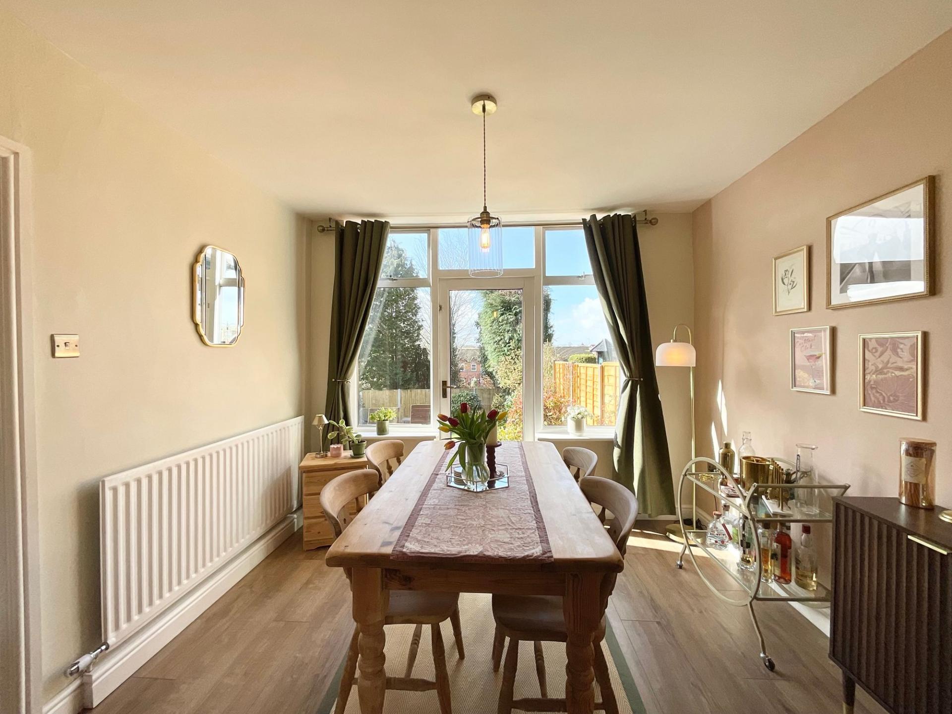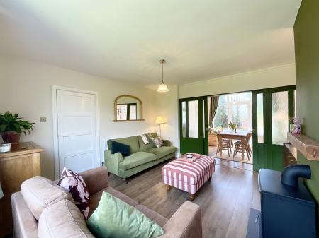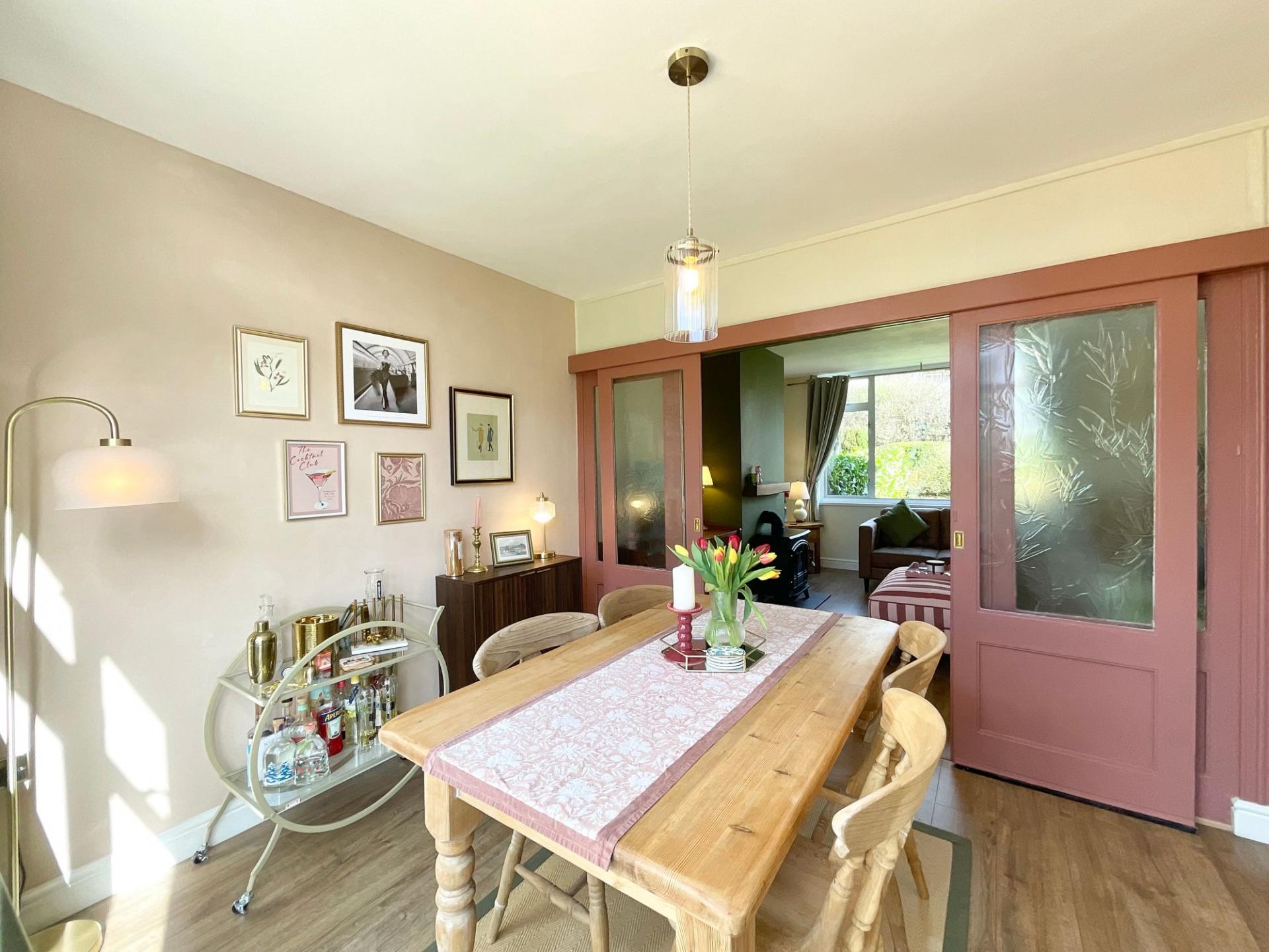 - Warm living room with sliding doors to bright dining area. Dining room has glazed French doors to rear garden, perfect for entertaining or family meals.