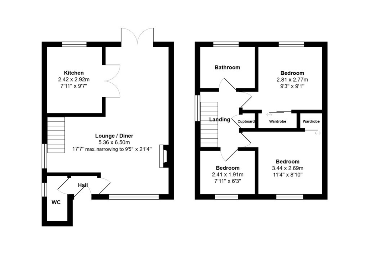 SITTING & DINING ROOM 17' 7" narrowing to 9' 5" x 21' 4" (5.36m x 6.5m) Double glazed shallow bay window to front, two radiators, dado rail, television and broadband points, stairs with spindle railed banister rising to firs floor, double doors to kitchen, double glazed French Doors opening to garden.