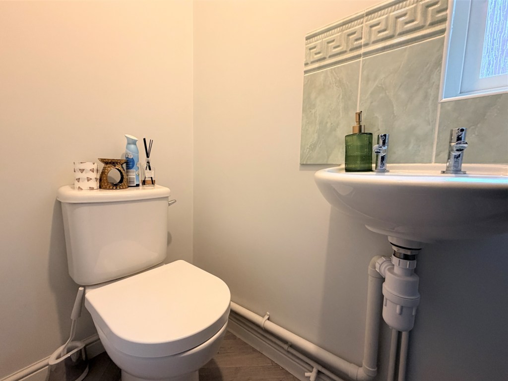 CLOAKROOM Obscure double glazed window to side, radiator, low level WC, mounted hand wash basin, tiled splash back, wood effect flooring.