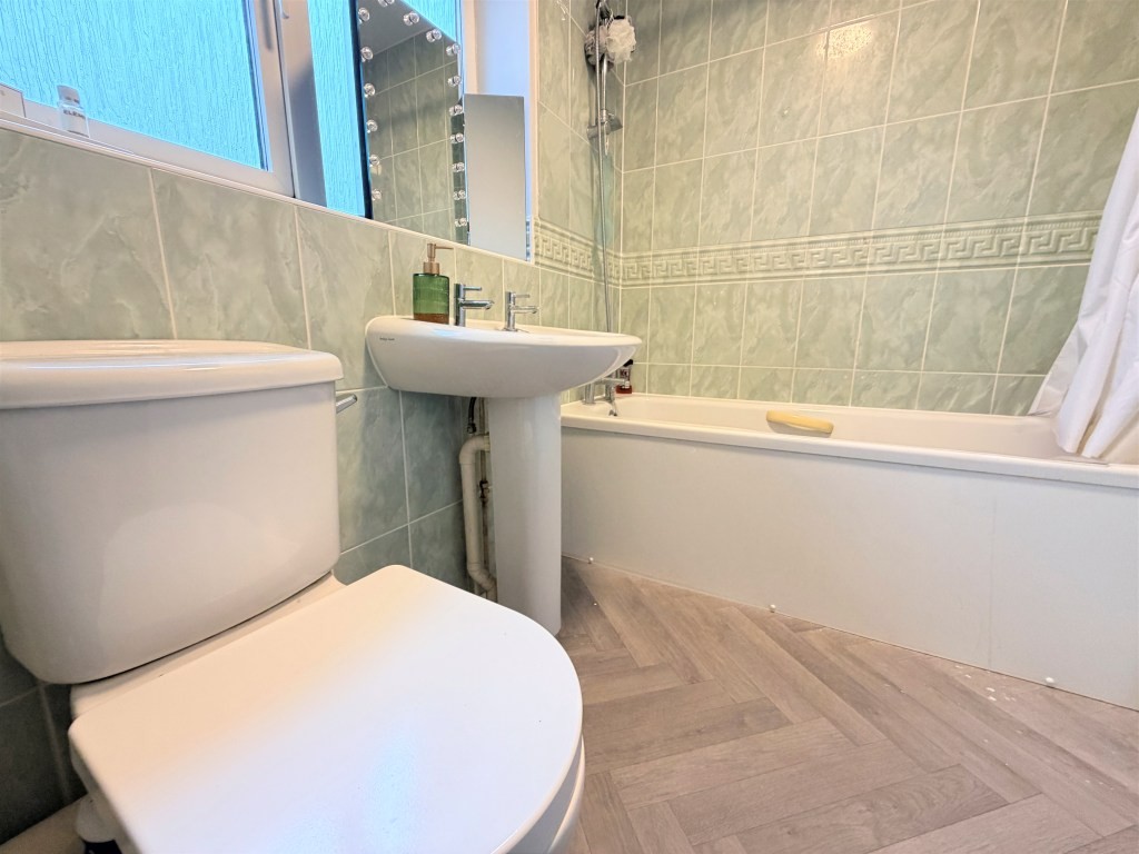 BATHROOM Obscure double glazed window to rear, radiator, panel bath with mixer tap and shower attachment, pedestal hand wash basin, low level WC, tiled splash backs, wood effect flooring, extractor fan.