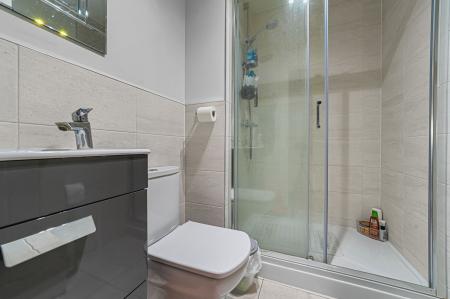 En-Suite Shower Room White suite comprising w.c, hand wash basin with storage below, tiled shower cubicle, heated towel rail, tiled walls, extractor and tiled flooring.