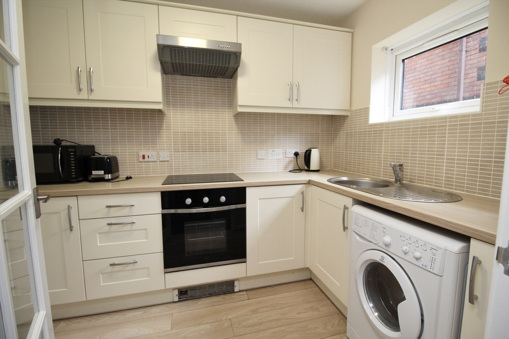 - The kitchen features a range of wall, base and drawer units, ample worktop space, sink unit, built-in oven and hob, plus space for a washing machine and freestanding fridge/freezer.