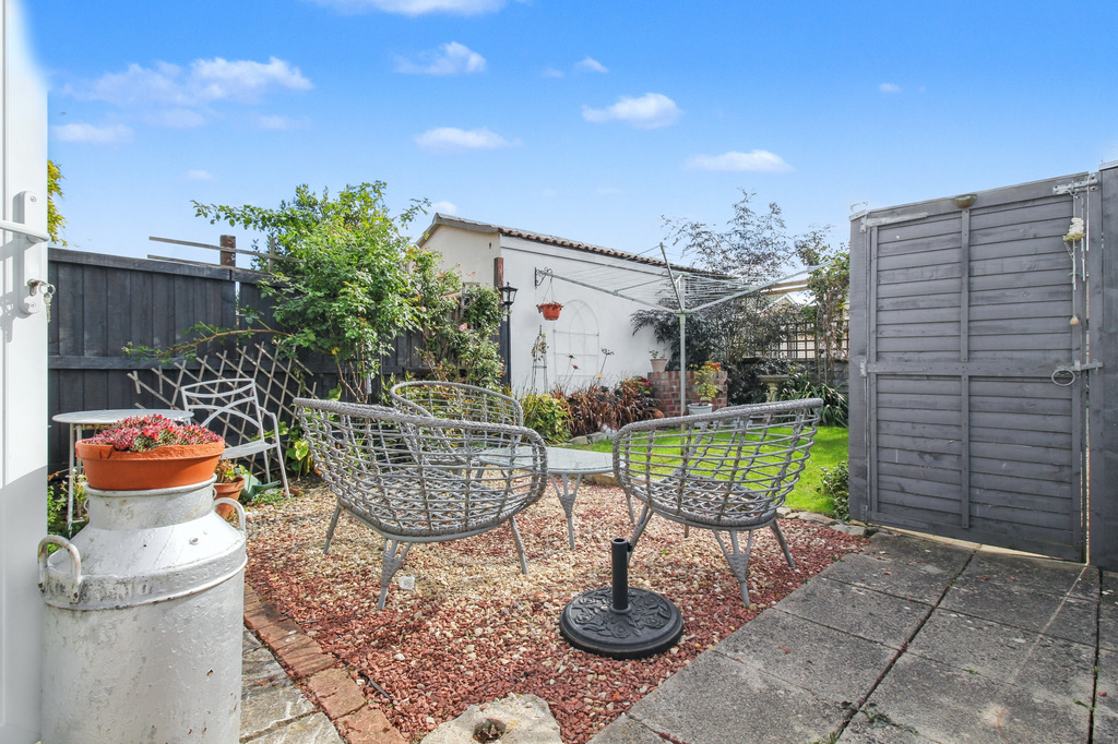 - An enclosed rear garden combining patio and gravel seating, lawn edged with shrubs and flowers, and a picturesque garden well adding charm.