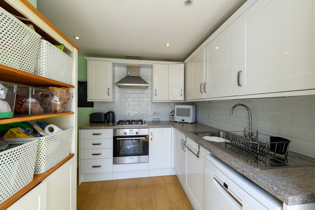 - Kitchen fitted with a stylish range of units, integrated Bosch gas hob and oven, plus space for a dishwasher and fridge/freezer
