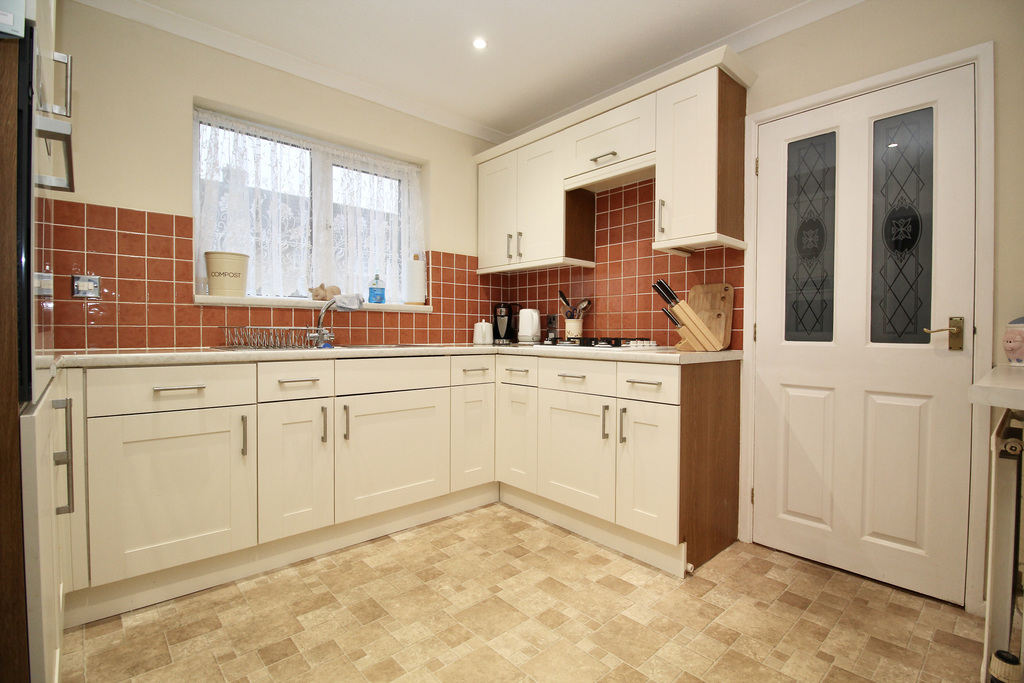 - Shaker-style kitchen with wall, base and drawer units, integrated oven and hob with an opening to a utility area with plumbing for laundry appliances and space for a fridge freezer.