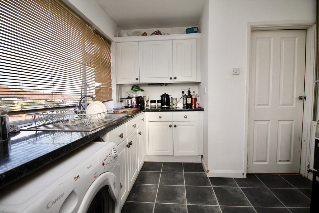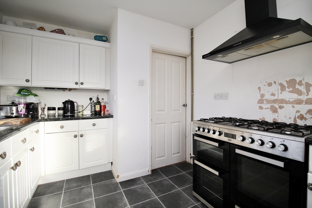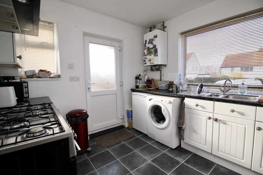 - Kitchen fitted with wall, base and drawer units, space for a range-style cooker and under-counter appliances, a large front window and a side access door.