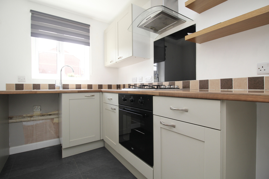 - The kitchen is appointed with shaker-style units and ample wall, base and drawer storage, incorporating a built-in oven and hob, with space for a fridge/freezer and washing machine.