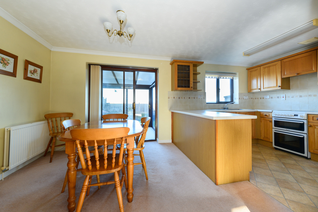 - The kitchen/diner is generously sized, featuring a range of wall, base, and drawer units with space for appliances. The dining area comfortably accommodates a family-sized table and chairs.