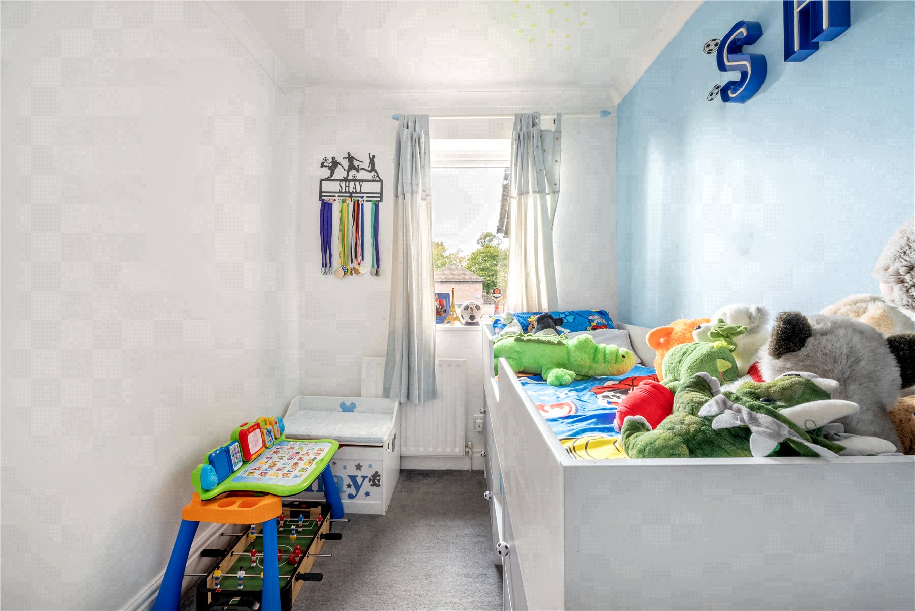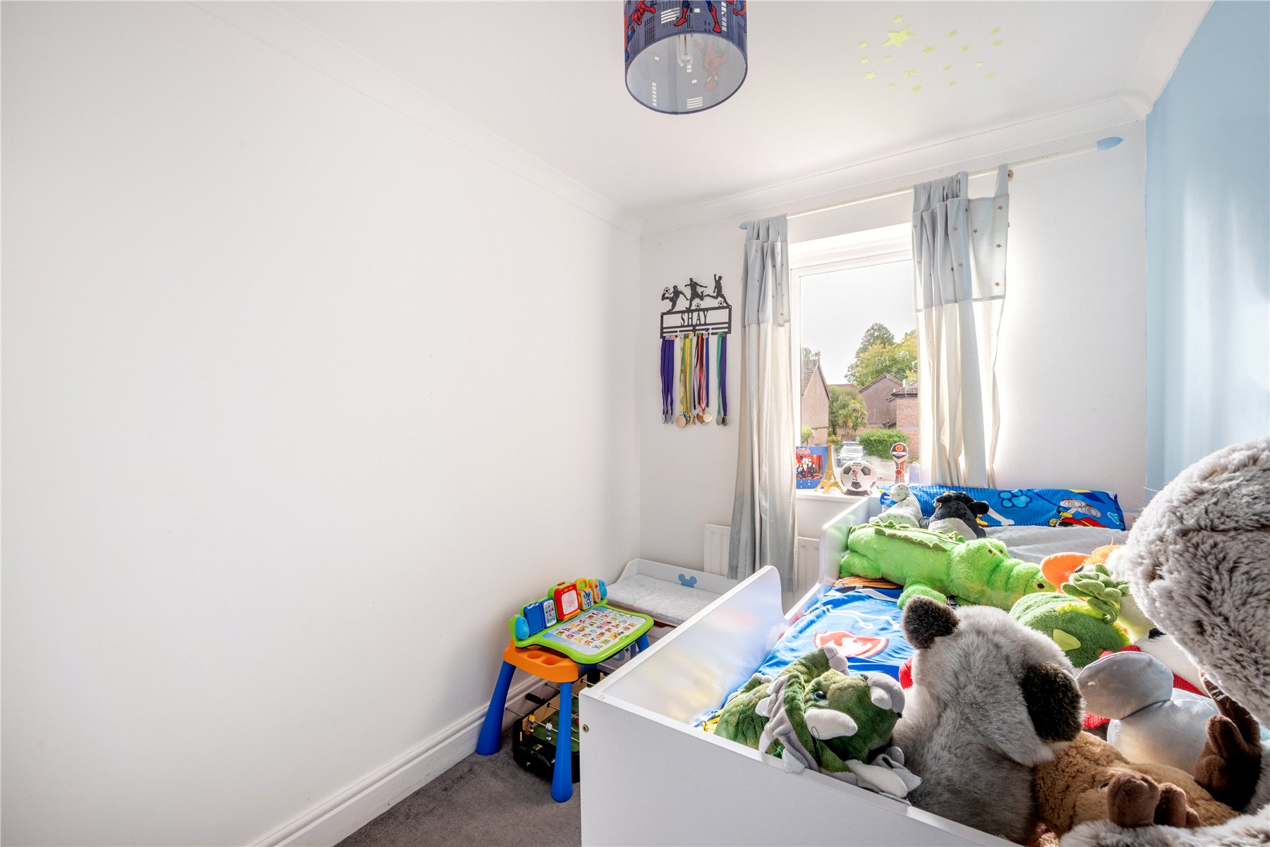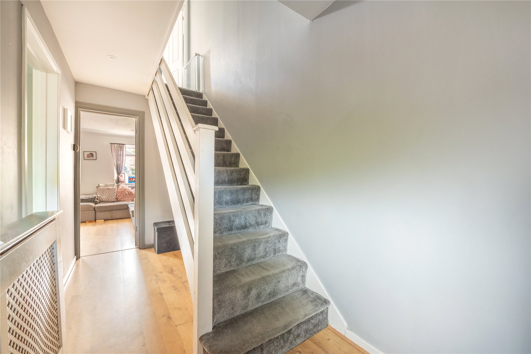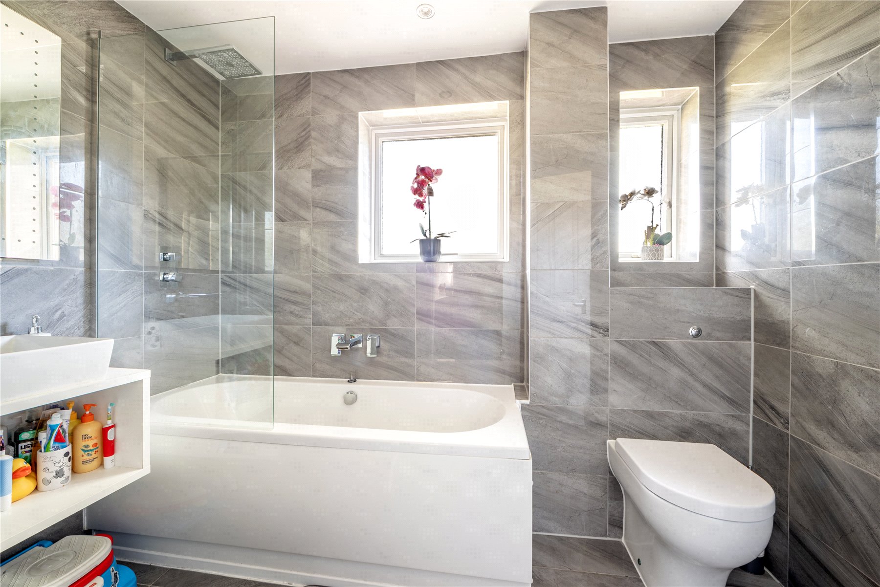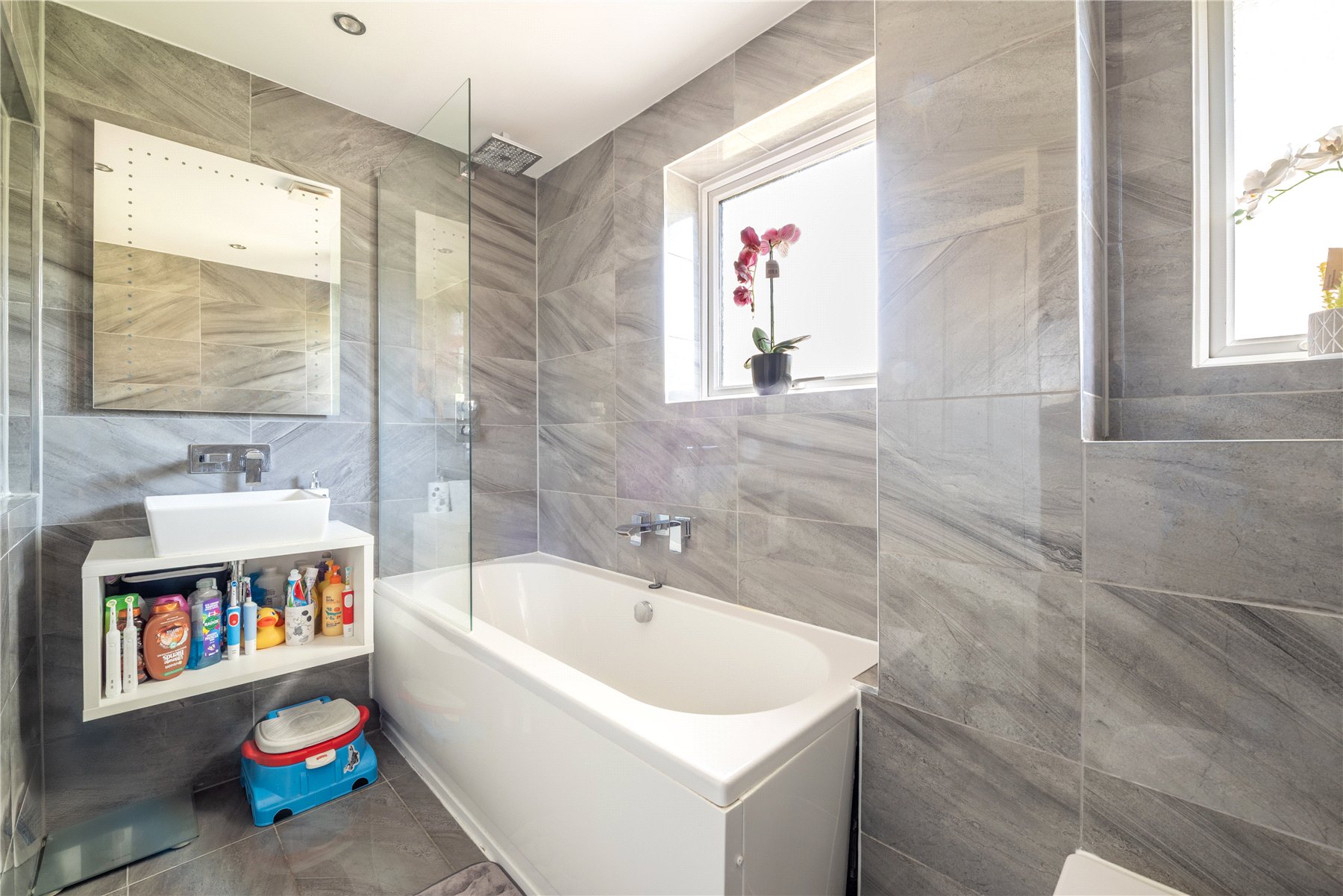 Upstairs, you'll find three bedrooms and a recently updated bathroom featuring a contemporary suite complemented by stylish grey tiling for a modern and sophisticated finish.