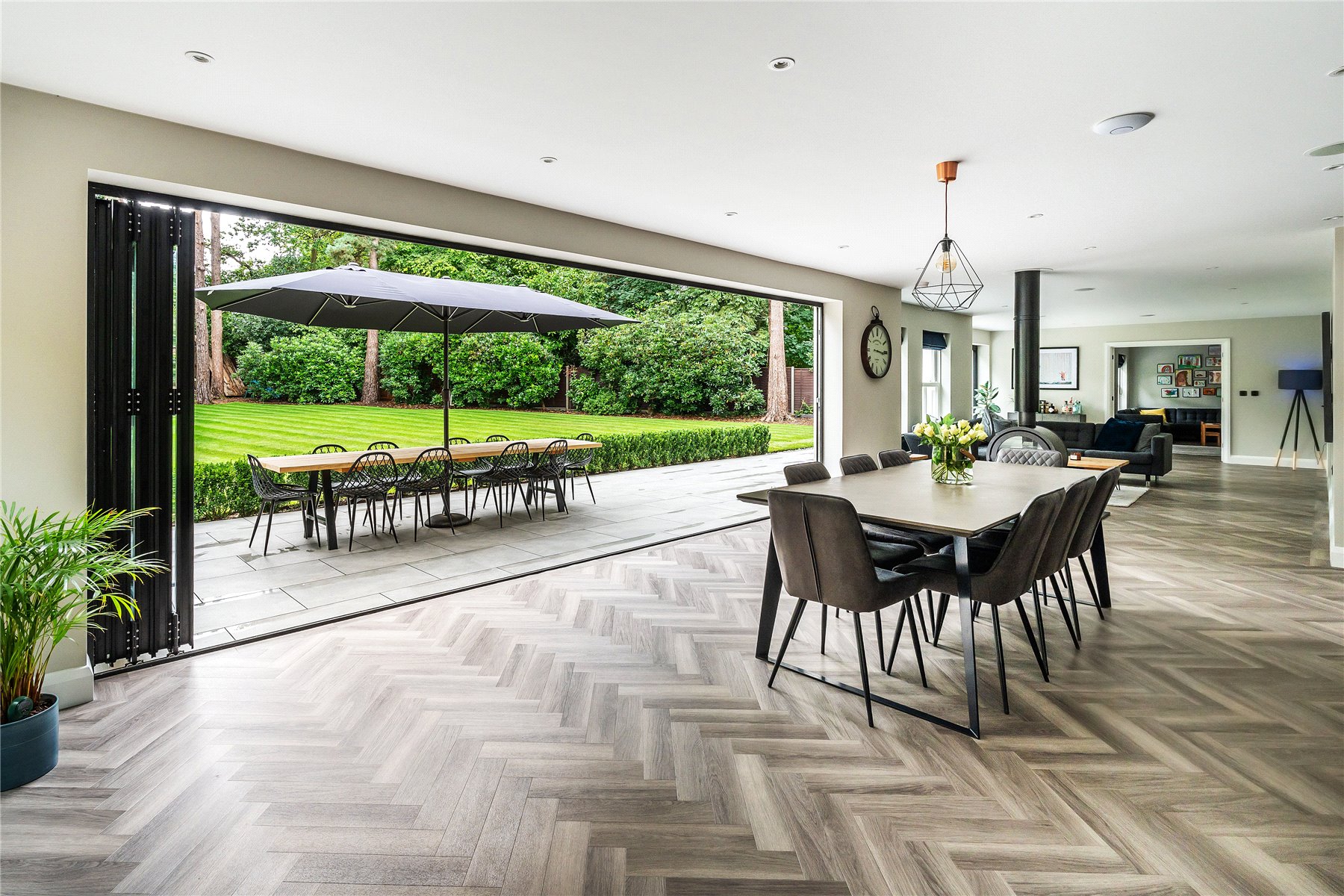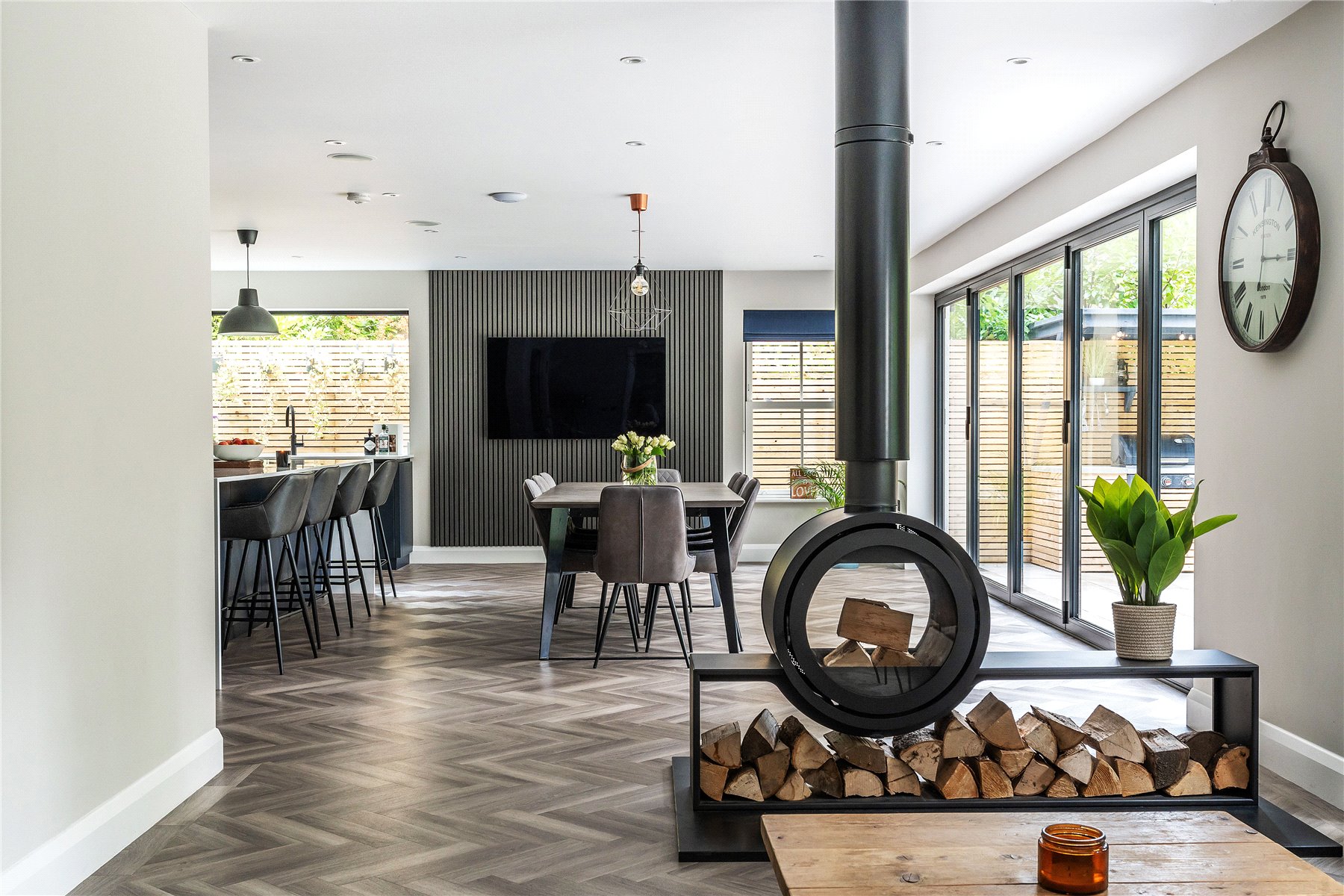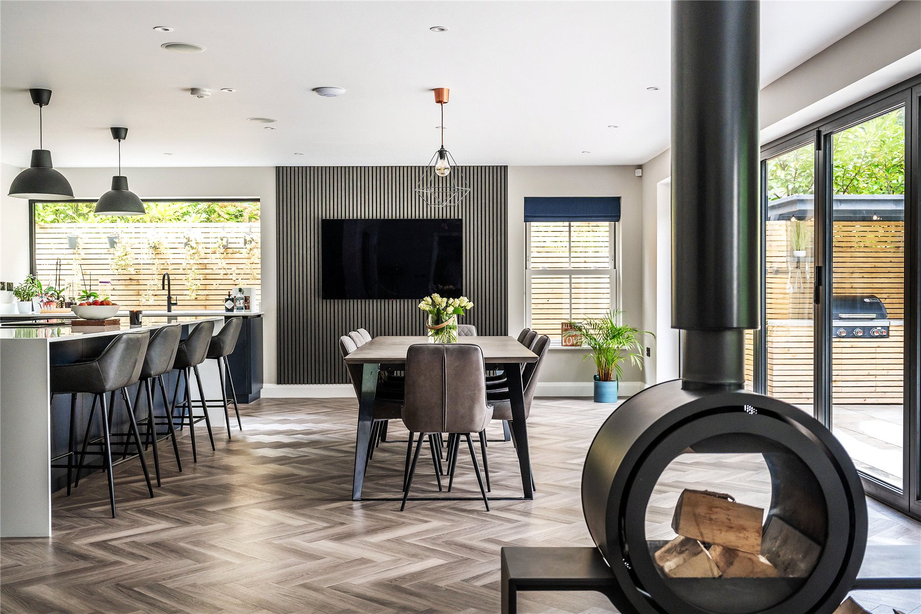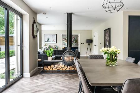 Secluded, south facing and utterly striking, the capacious rear gardens transport you from the world outside to your own personal oasis. An expanse of bi-fold doors allows daily life to filter out onto a landscaped terrace that conjures a tremendous place for al fresco entertaining. At one end an outdoor sitting room caters for the unpredictability of the British weather with its wood burner, and has an electric heater and a fitted bar stool seating area with a fridge. At the other end a fitted barbeque area sits undercover and has an integrated grill as well as a dedicated spot for a Big Green Egg Kamado.