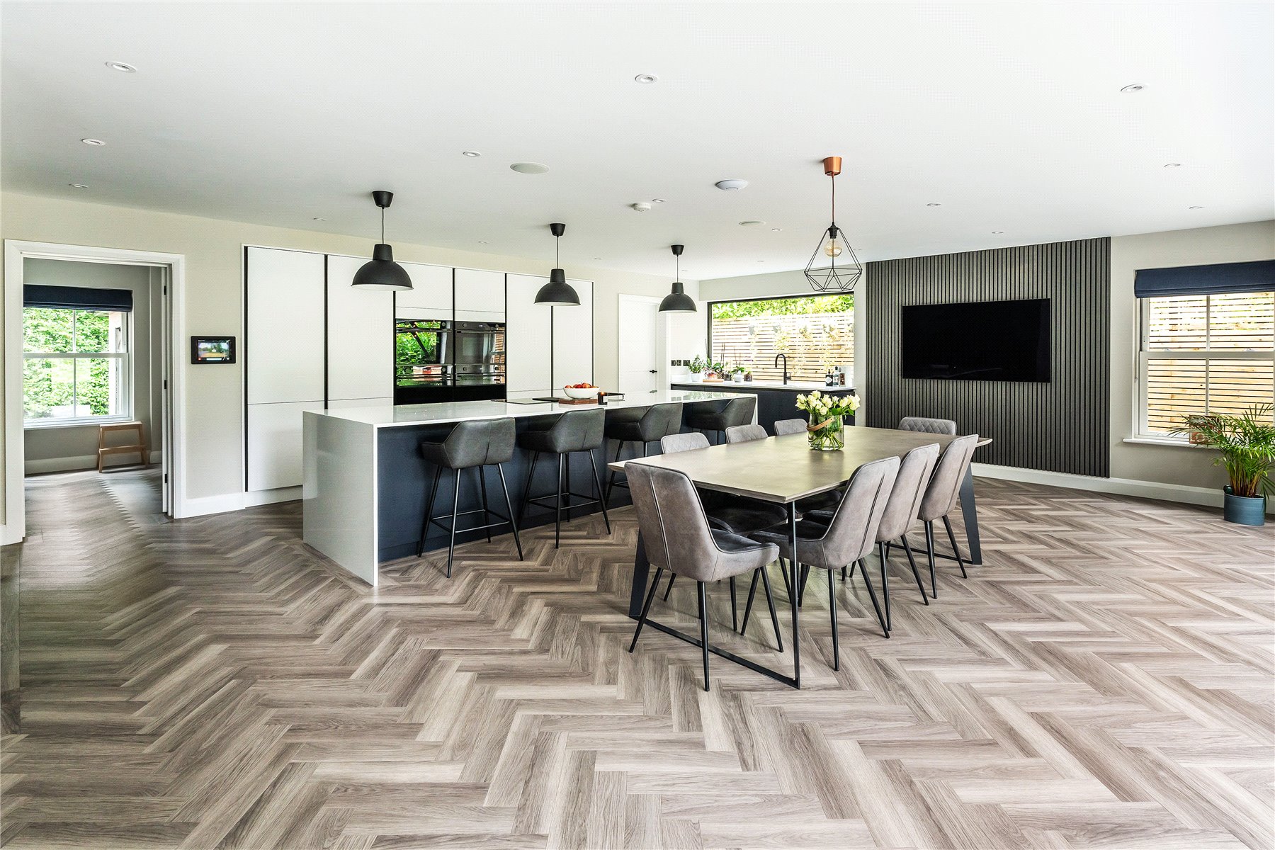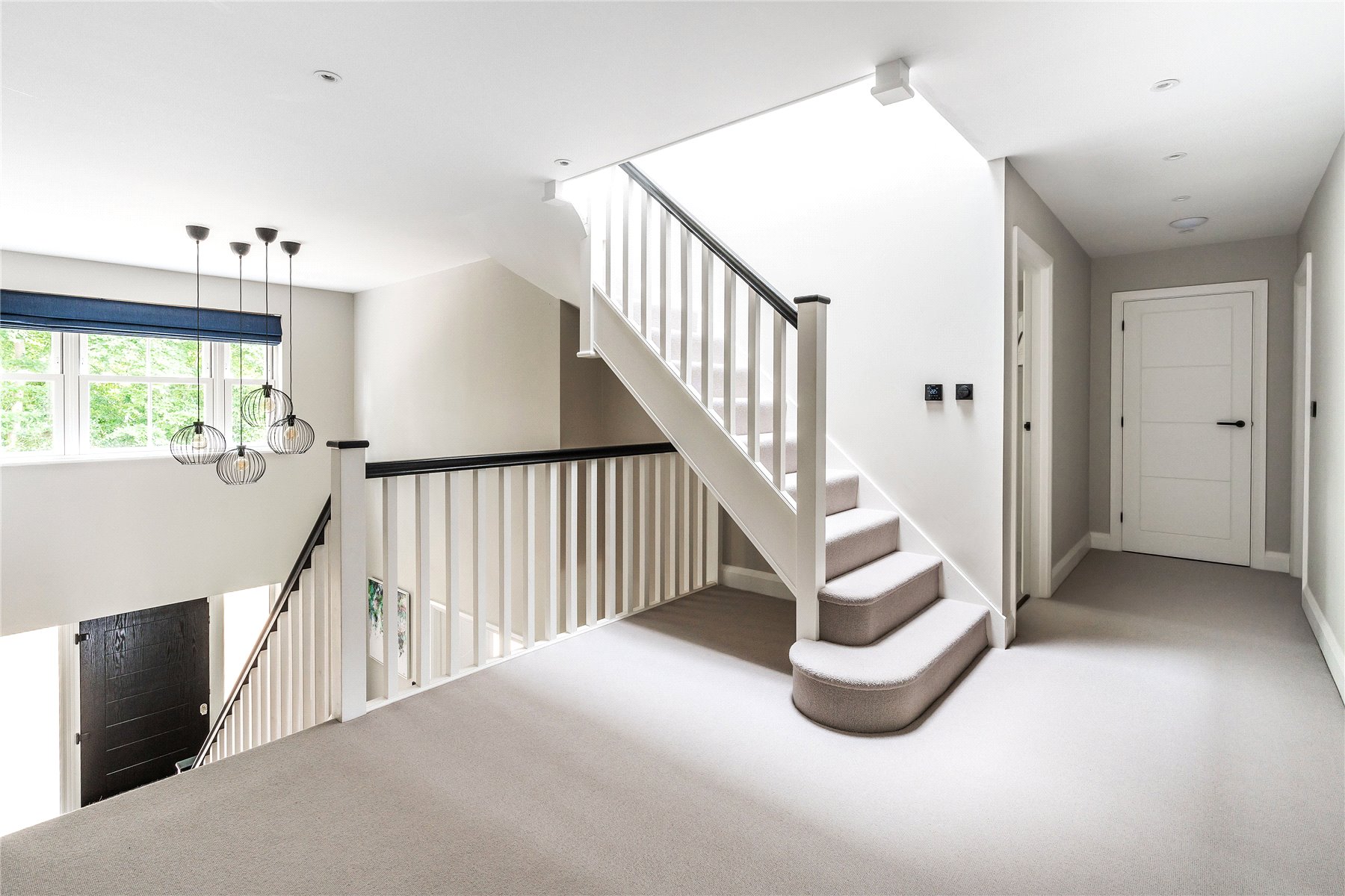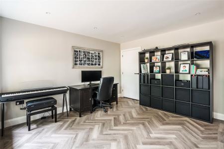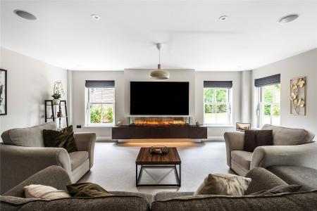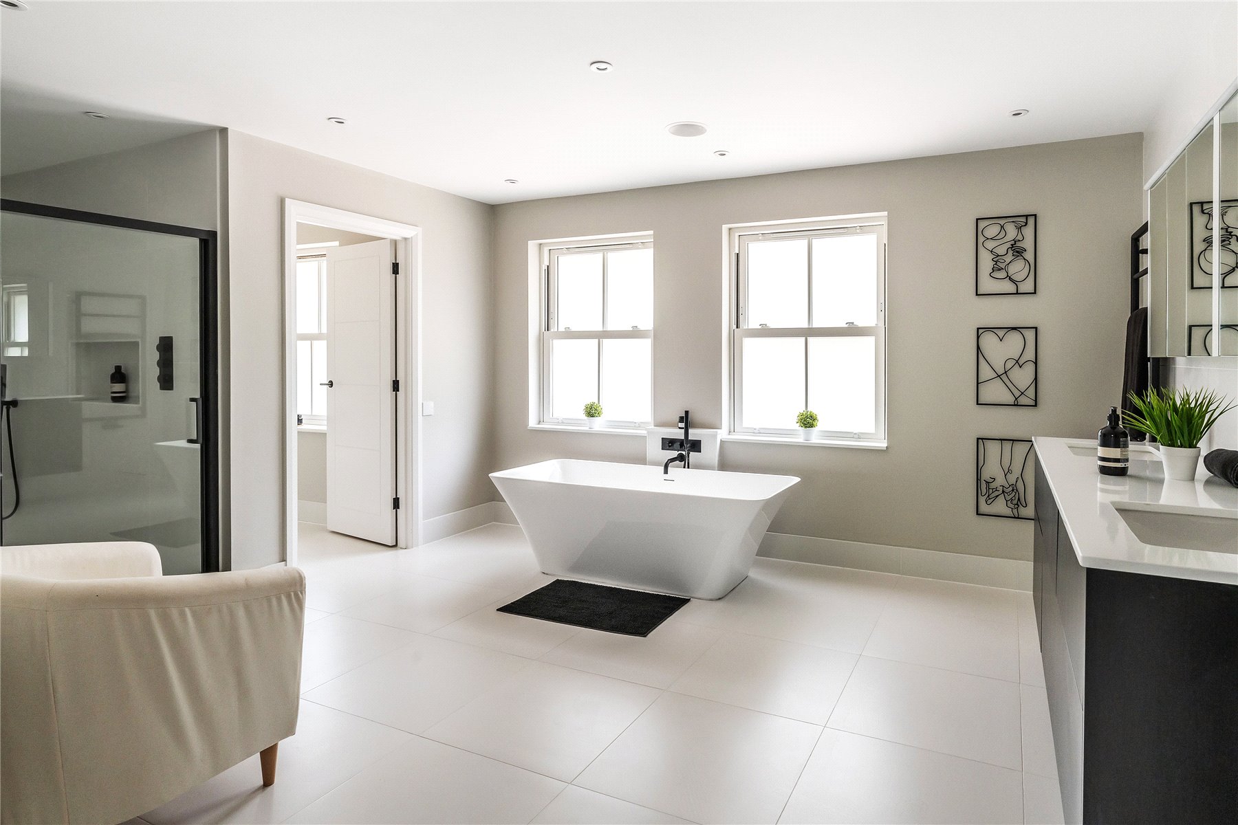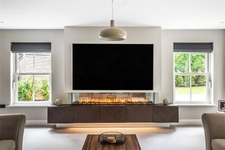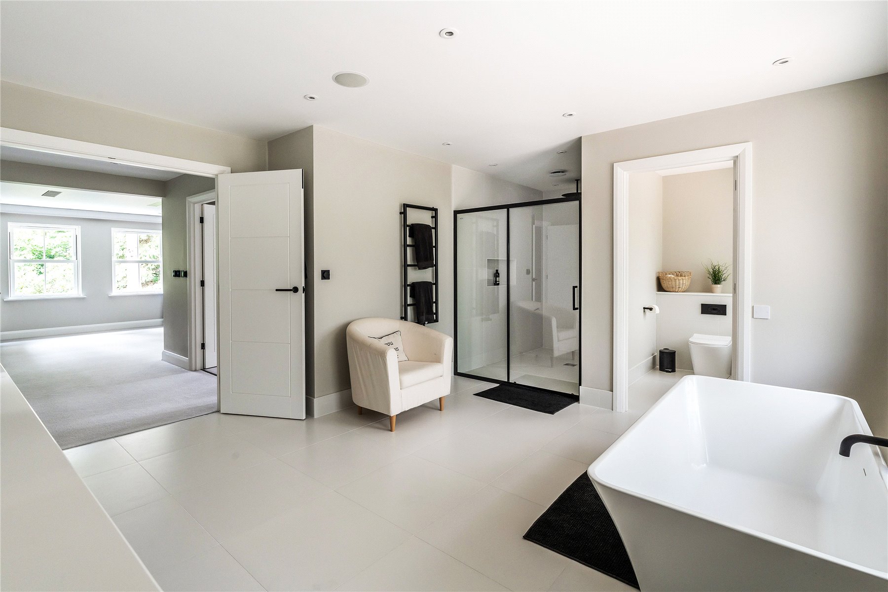 Generating a hugely cohesive home, upstairs the palette of warm muted tones is once again peppered with matte black detailing and paired with the greenery of garden vistas. Wrapping around the galleried landing of the first floor, three light filled double bedrooms each have deluxe en suites. Extending out across the full depth of the property, an immense principal bedroom creates its own wing of the house. Graceful yet ultimately luxurious it has an integrated speaker system, a wonderfully large immaculately fitted dressing room, and a vast en suite where a contemporary freestanding bathtub adds a superb centrepiece. A floating console of twin basins framed by a duo of ladder radiators lends symmetry, a walk-in shower has a ceiling mounted waterfall head, and a WC sits discreetly hidden behind a door.