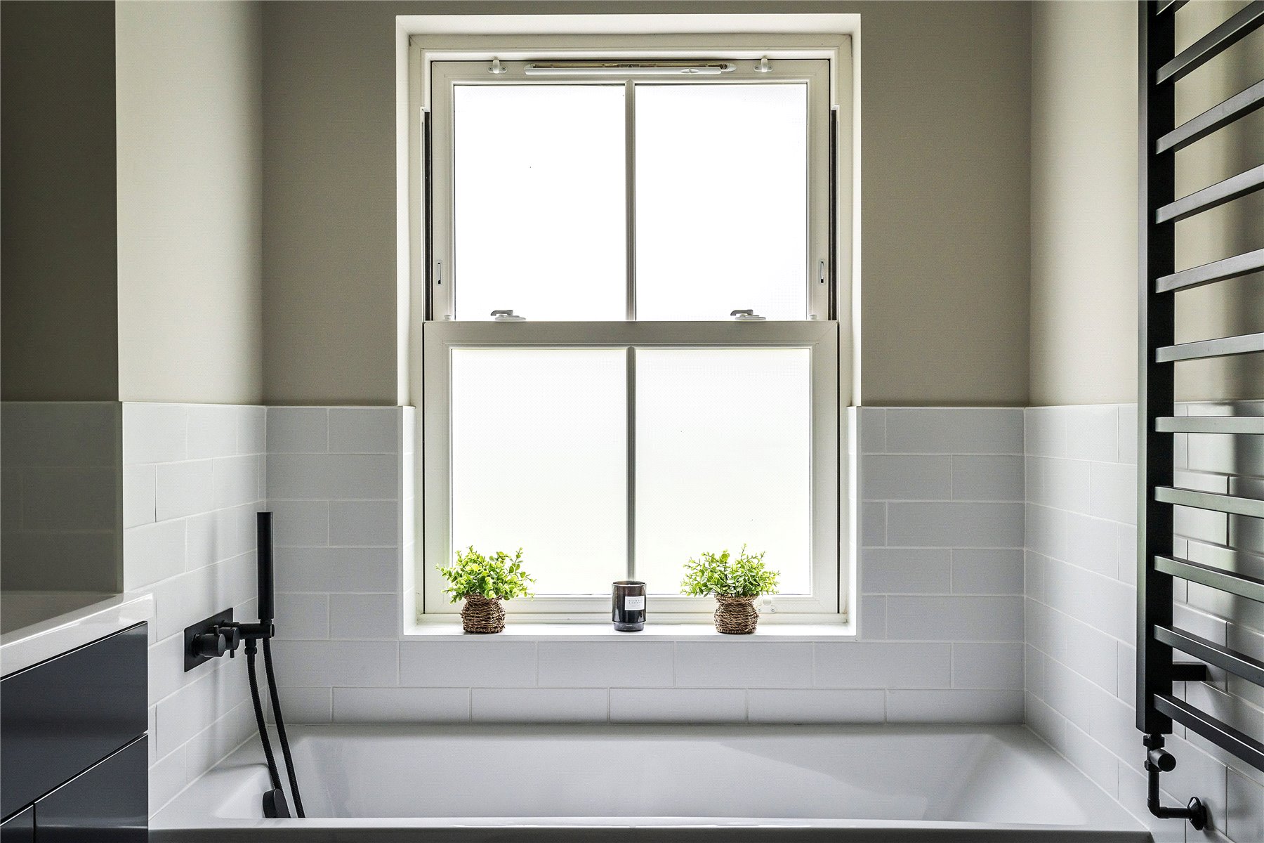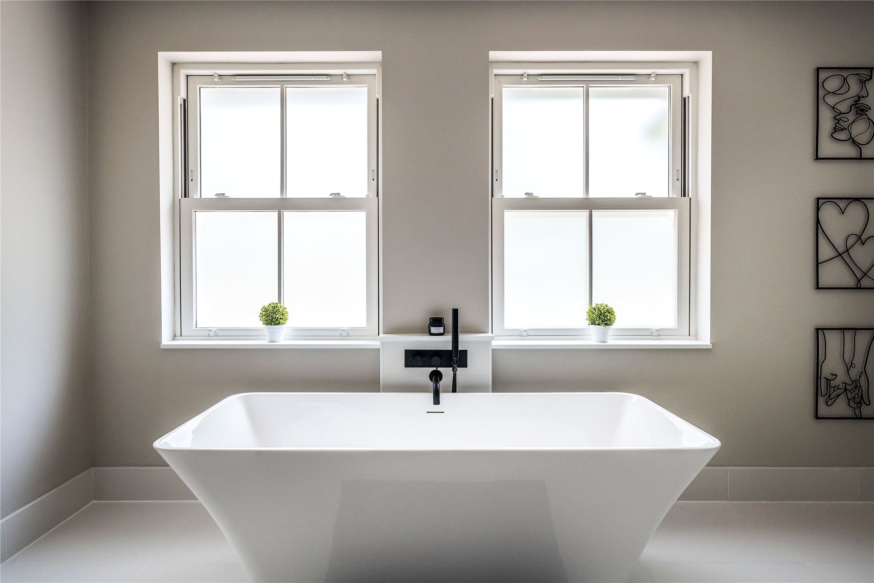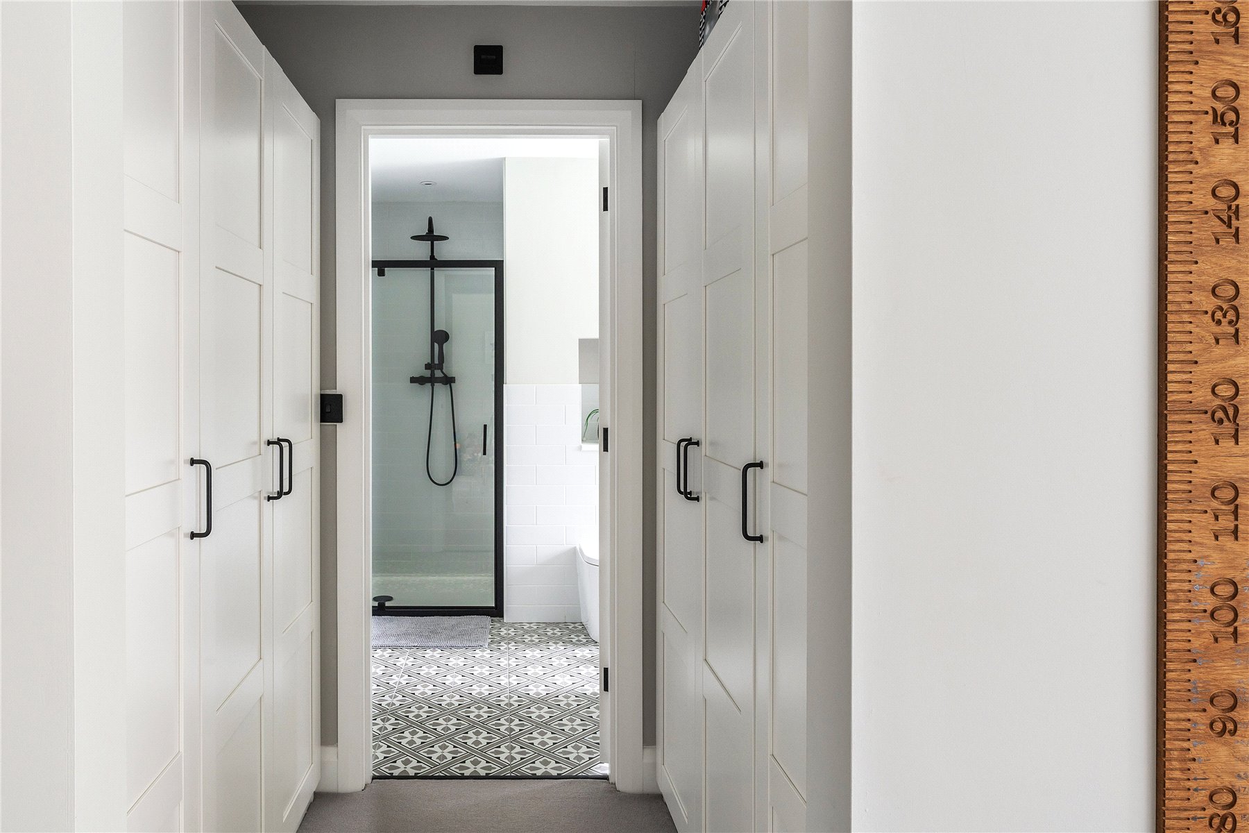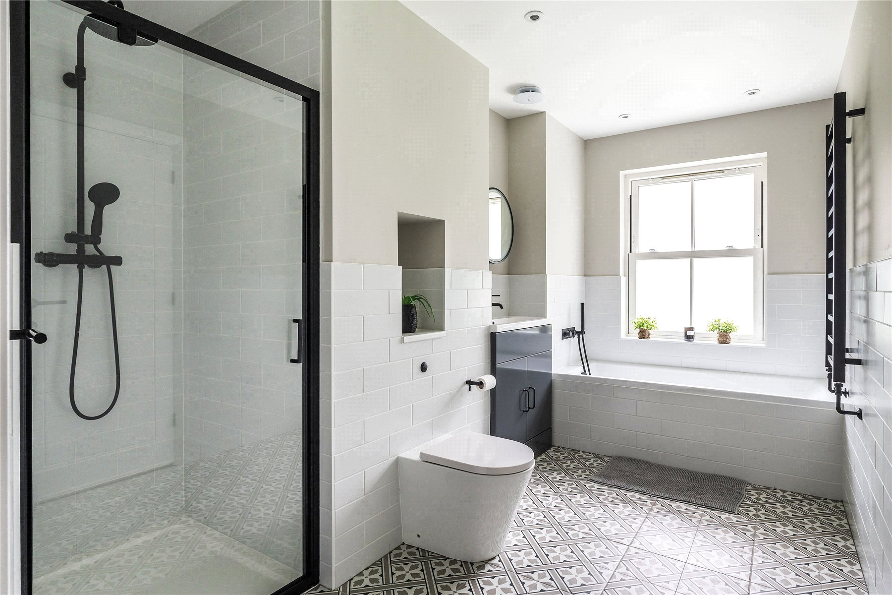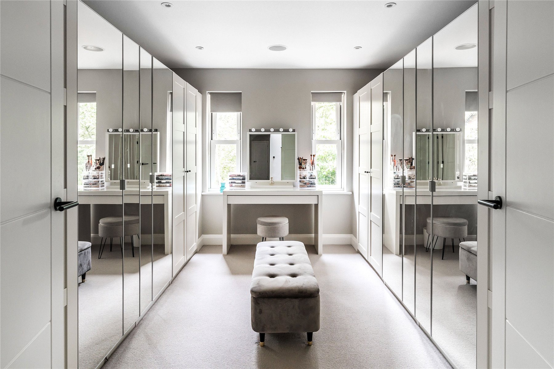 Generating a hugely cohesive home, upstairs the palette of warm muted tones is once again peppered with matte black detailing and paired with the greenery of garden vistas. Wrapping around the galleried landing of the first floor, three light filled double bedrooms each have deluxe en suites. Extending out across the full depth of the property, an immense principal bedroom creates its own wing of the house. Graceful yet ultimately luxurious it has an integrated speaker system, a wonderfully large immaculately fitted dressing room, and a vast en suite where a contemporary freestanding bathtub adds a superb centrepiece. A floating console of twin basins framed by a duo of ladder radiators lends symmetry, a walk-in shower has a ceiling mounted waterfall head, and a WC sits discreetly hidden behind a door.