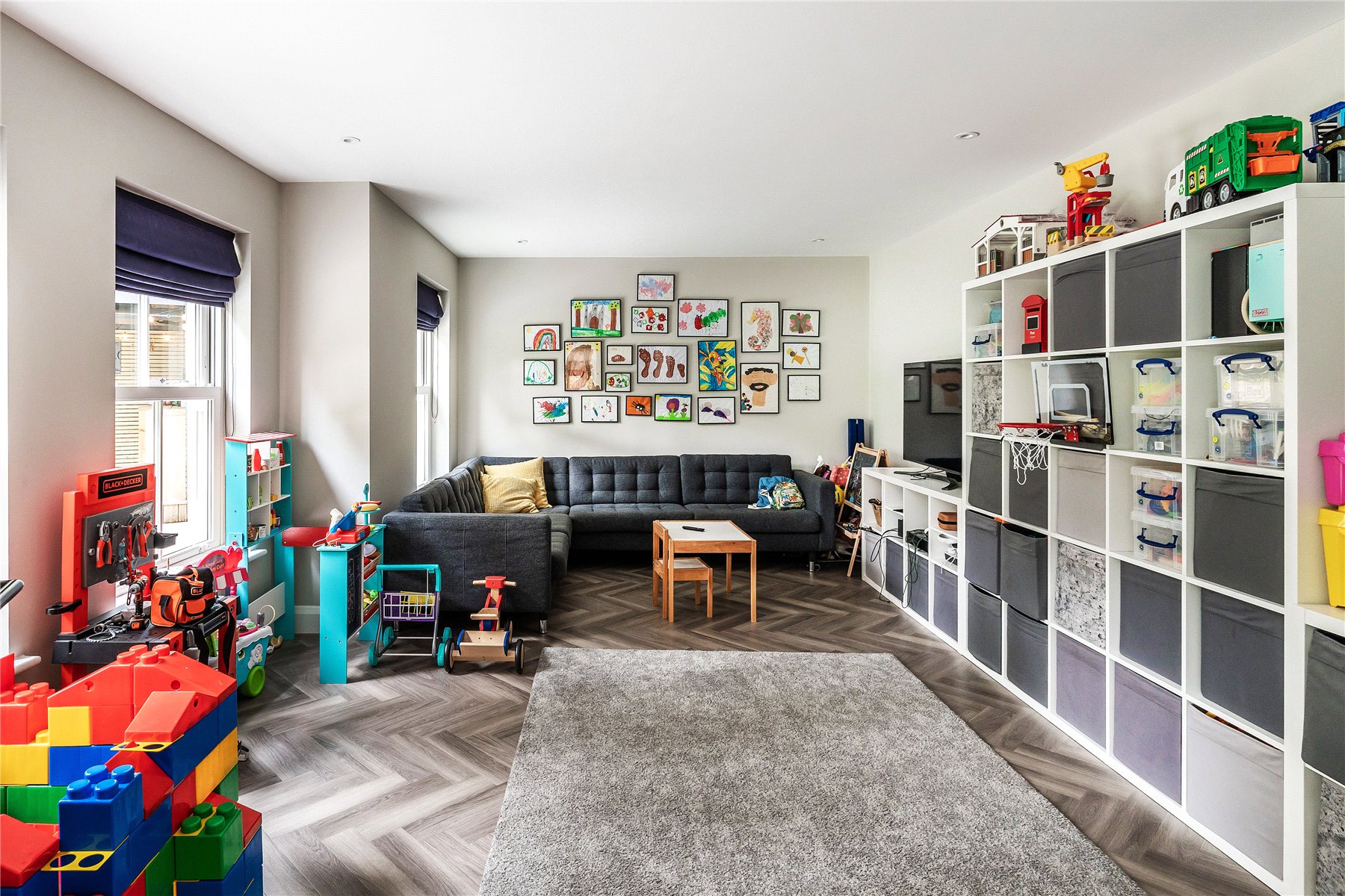 Circular and double sided, a wonderfully chosen Dik Geurts DG Odin wood burning stove with a Plateau bench gives delineation and unity to the exemplary sitting and dining spaces, while twin sets of bi-fold doors allow the terracing, barbeque area and al fresco sitting room to become an easy flowing extension of your home. Versatile to your needs and giving children their own sense of space, double doors open from the sitting room to reveal an adjoining playroom that enables toys and games to be hidden out of sight.
