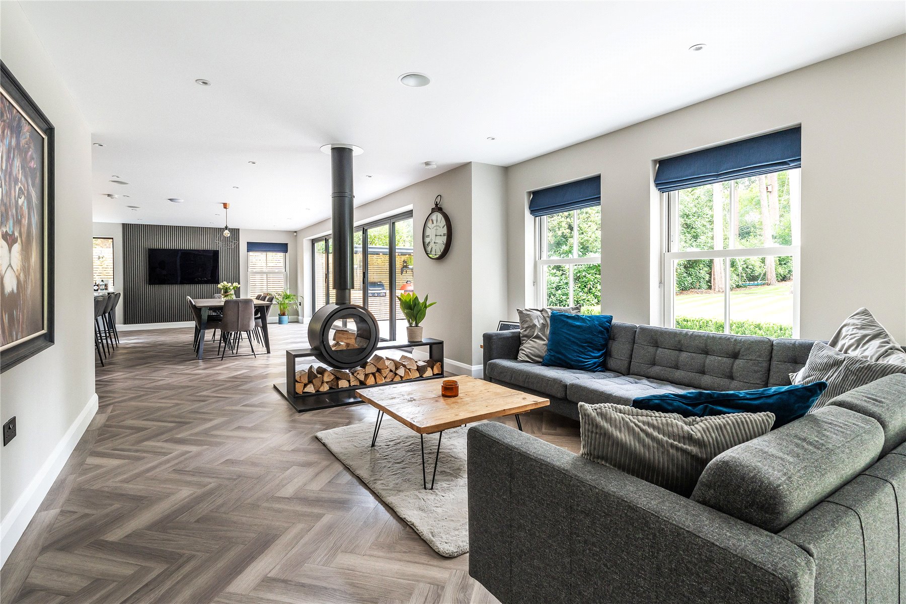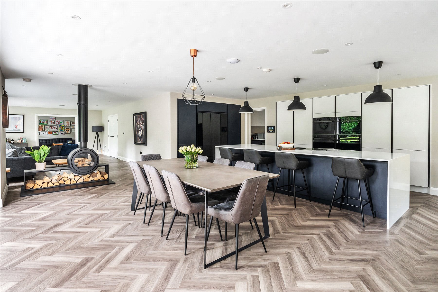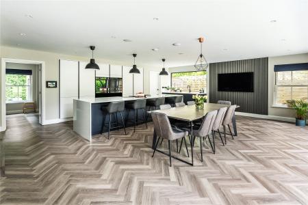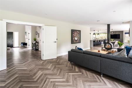 Bathed in light from a double height ceiling, a central entrance hall unfolds onto a wealth of space in which to relax, dine, entertain and work from home when the need arises. Instantly generating a noted level of cohesion, the rich sultry hues of its herringbone floor stretch out underfoot extending through double doors into a simply outstanding kitchen/sitting/dining room. Spacious, double aspect and offering a seamless interplay with the gardens, it is an incredibly special place for both day to day life and entertaining on a grand scale.