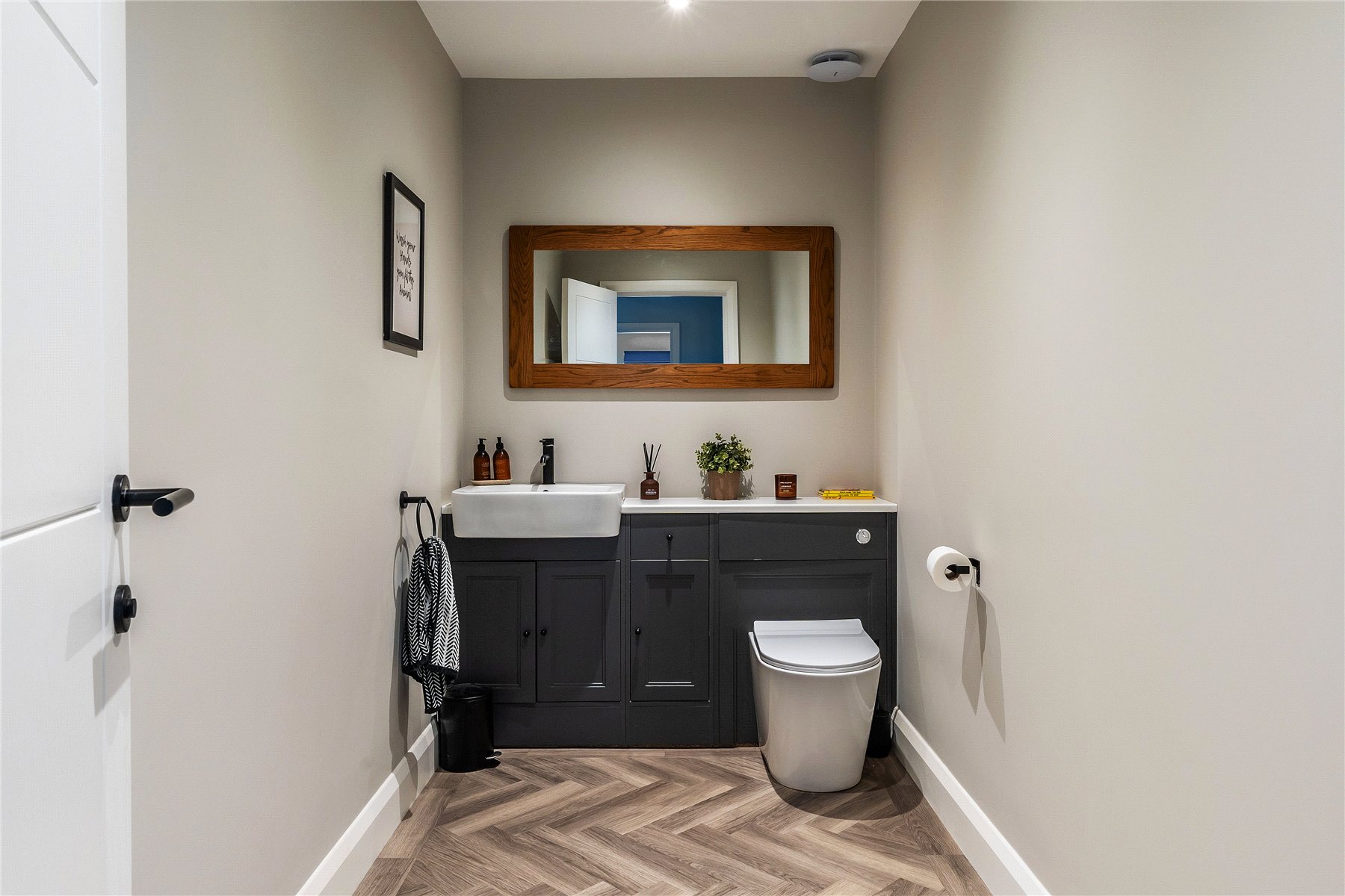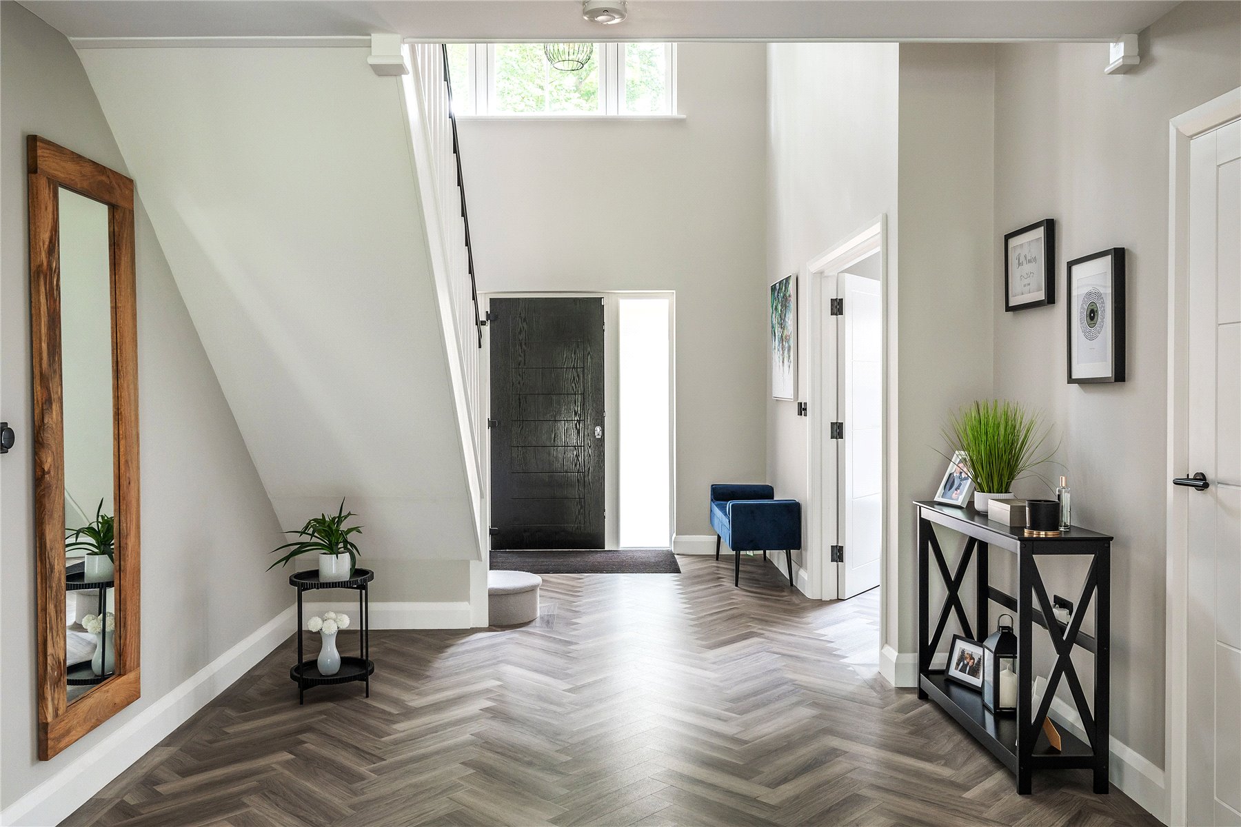 An admirably proportioned study echoes the aesthetic giving a peaceful retreat for working from home and plenty of chance to have a music room or gym if preferred. However when it comes to escaping from a busy day and enjoying a family film night, the weekend's sport or simply kicking back with a good book and a glass of wine, the addition of a separate double aspect reception room produces a sublime space in which to do so. Framed by a duo of modern sash windows, the warming flames of a brilliantly broad glass fronted bio ethanol fireplace lend a cosy yet contemporary focal point beneath the perfect spot for a large wall-mounted Smart TV. A cloakroom completes the layout of the ground floor.