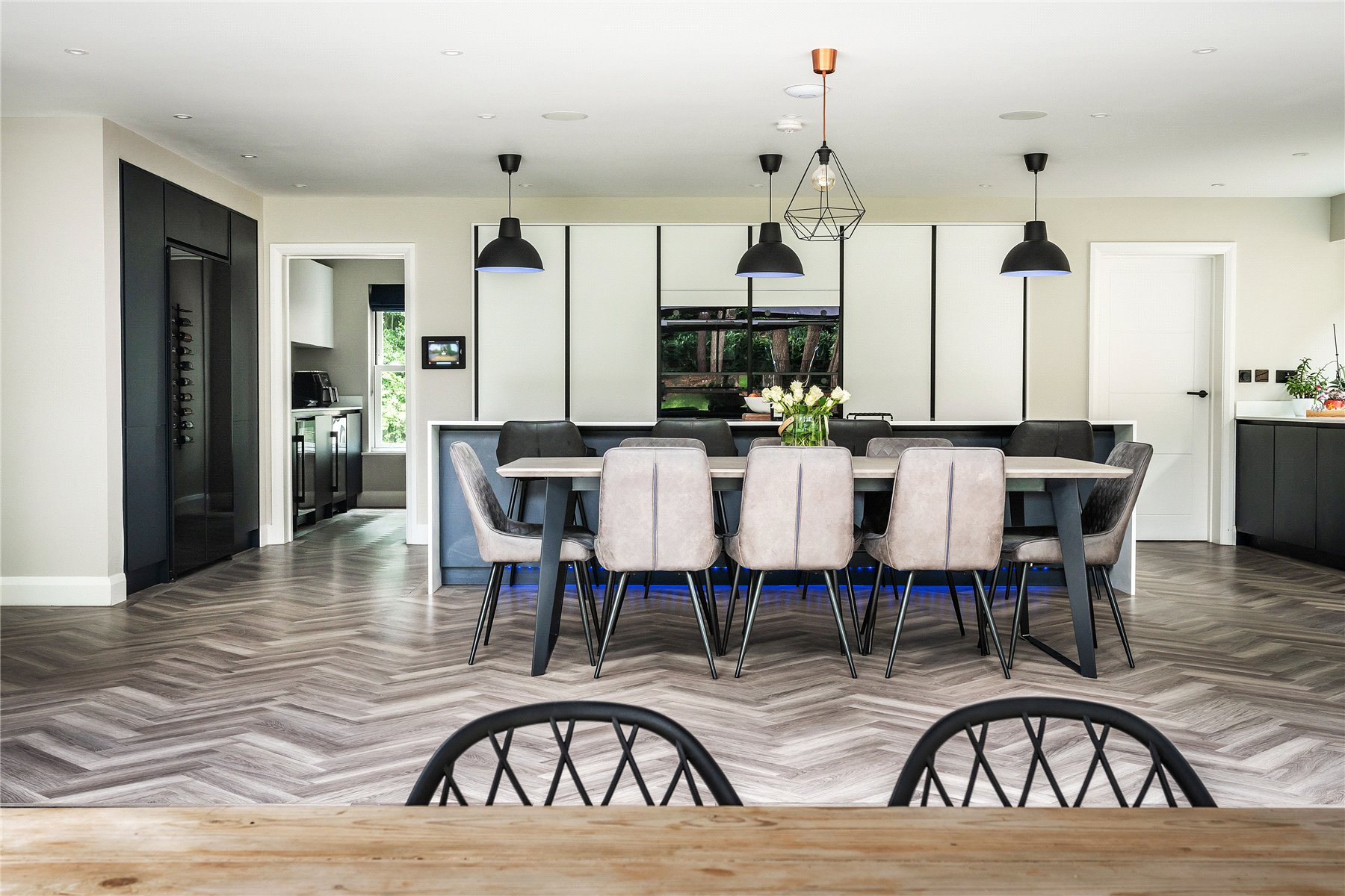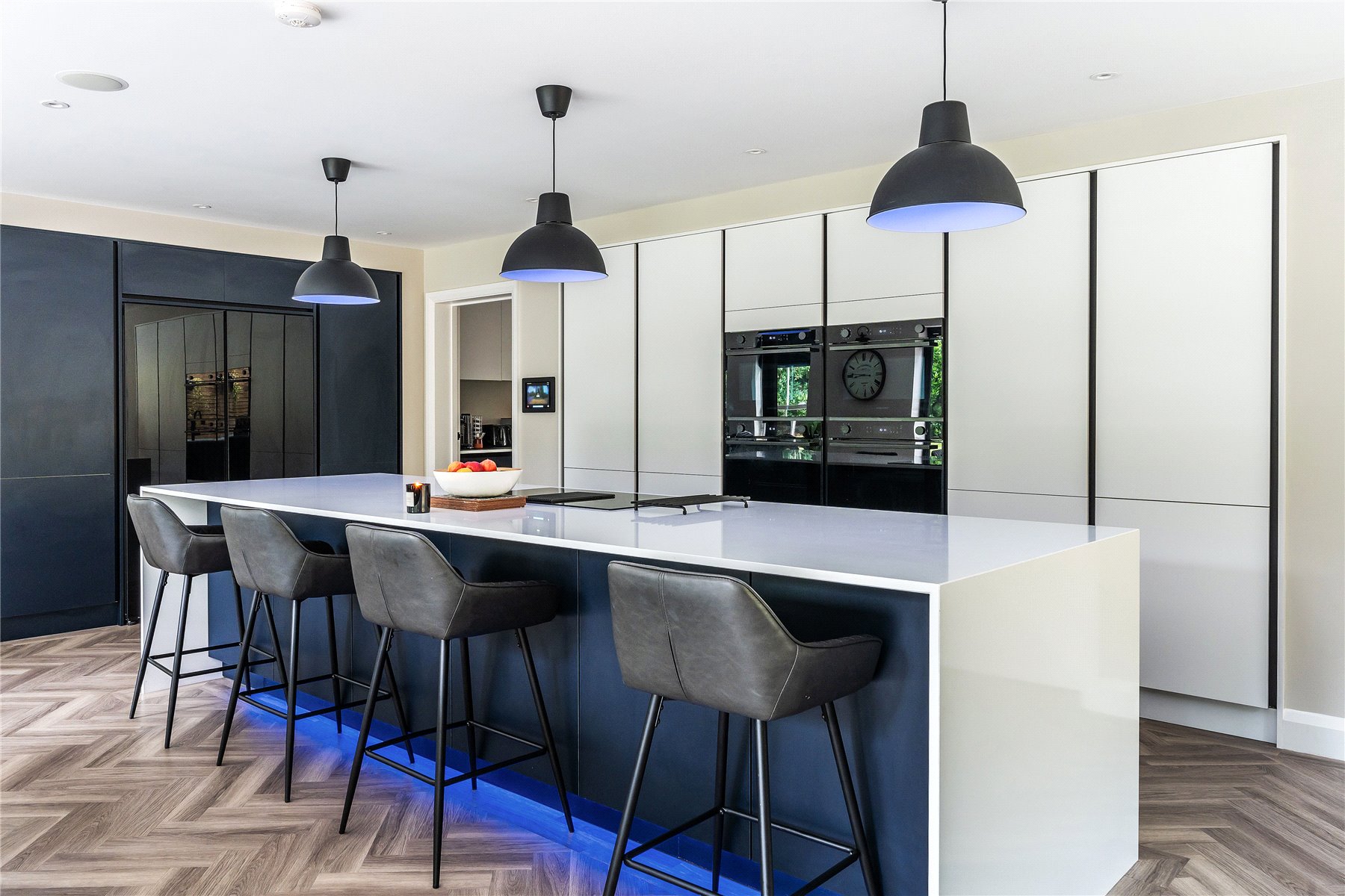 Supremely well-appointed to offer every convenience, the considerably large kitchen is fully fitted with the sleek clean lines of handleless cabinetry housing a bank of four integrated ovens. The black glass double doors of a fridge freezer blend beautifully with the surrounding dark blue cabinets, while an expansive central island with copious bar stool seating and induction hob is encased with the streamlined finish of a waterfall countertop. Pendant and kickboard lighting illuminate this sociable space at night and a trio of utility, pantry and boot room are set off of this, with fitted top of the range wine fridges.