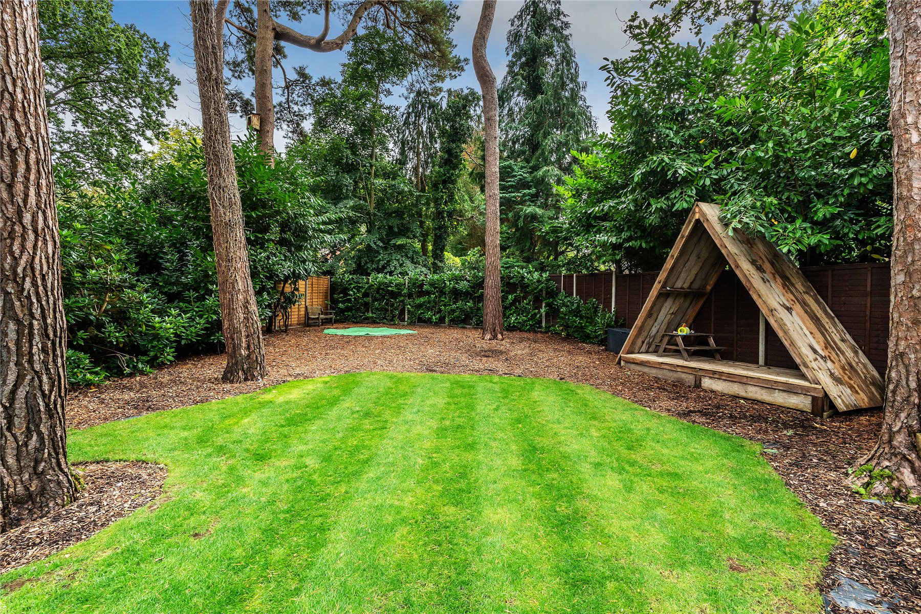 Bordered by heavenly high evergreen borders the stripes of an established lawn reach out before you tempting you to take a stroll to the rear where breathtakingly tall conifers give a woodland copse feel to an idyllic space where a timber tepee adds a blissful hideaway.