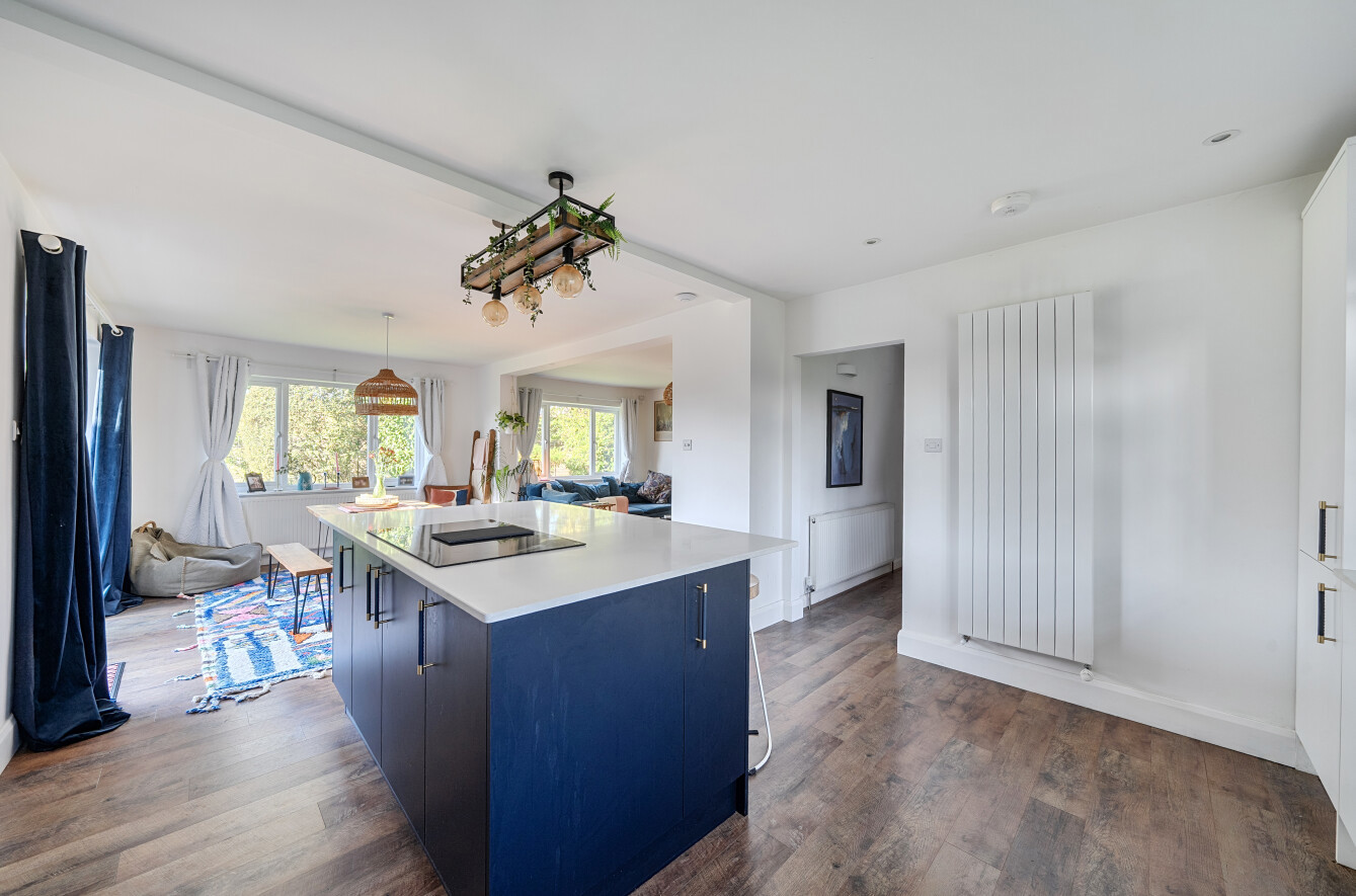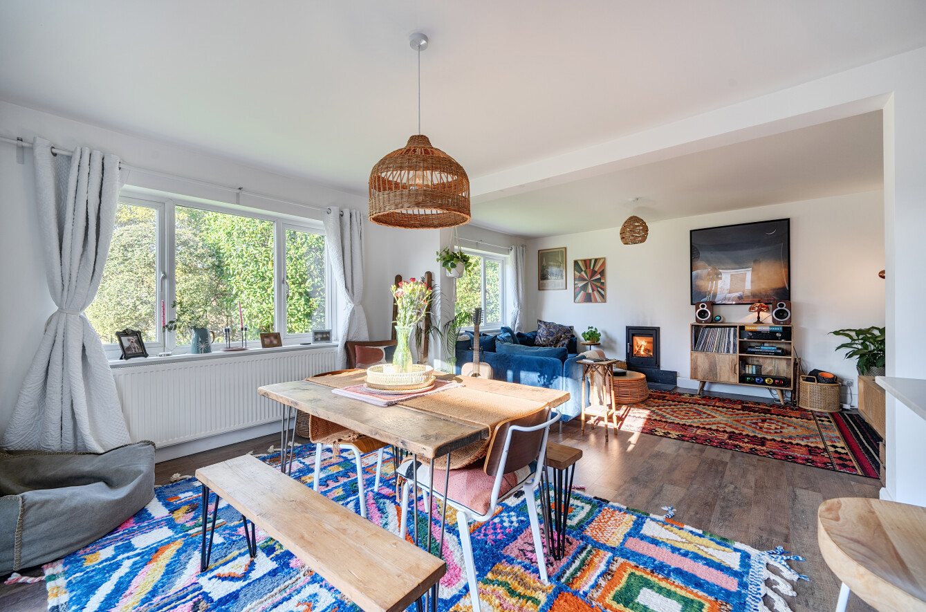 The home features three spacious bedrooms, three versatile reception areas, and two stylish bathrooms, all presented to a high standard throughout. At the heart of the property is a stunning open-plan kitchen, dining, and living space, thoughtfully designed for modern living. This impressive room is flooded with natural light and centred around a charming wood burner, creating a warm and inviting setting ideal for both entertaining and relaxing with family.