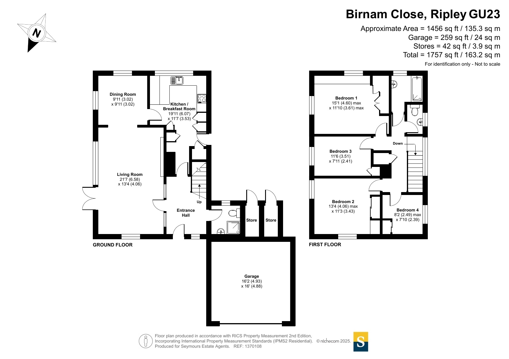 The kitchen is fitted with a generous range of modern shaker-style units and built-in storage, along with a peninsula breakfast bar ideal for casual dining. A door opens to the garden, where there are two useful store rooms situated at the rear of the large garage.