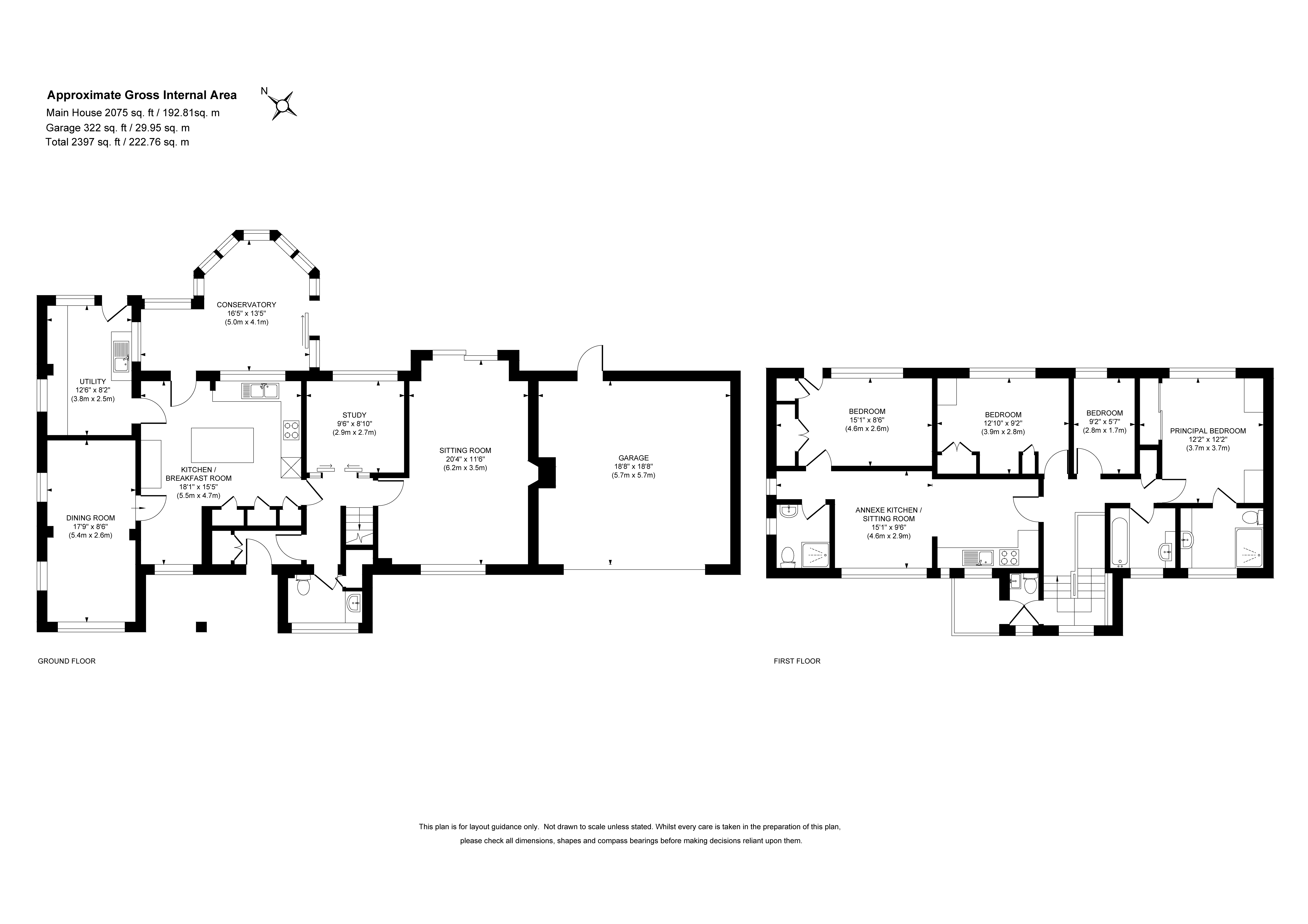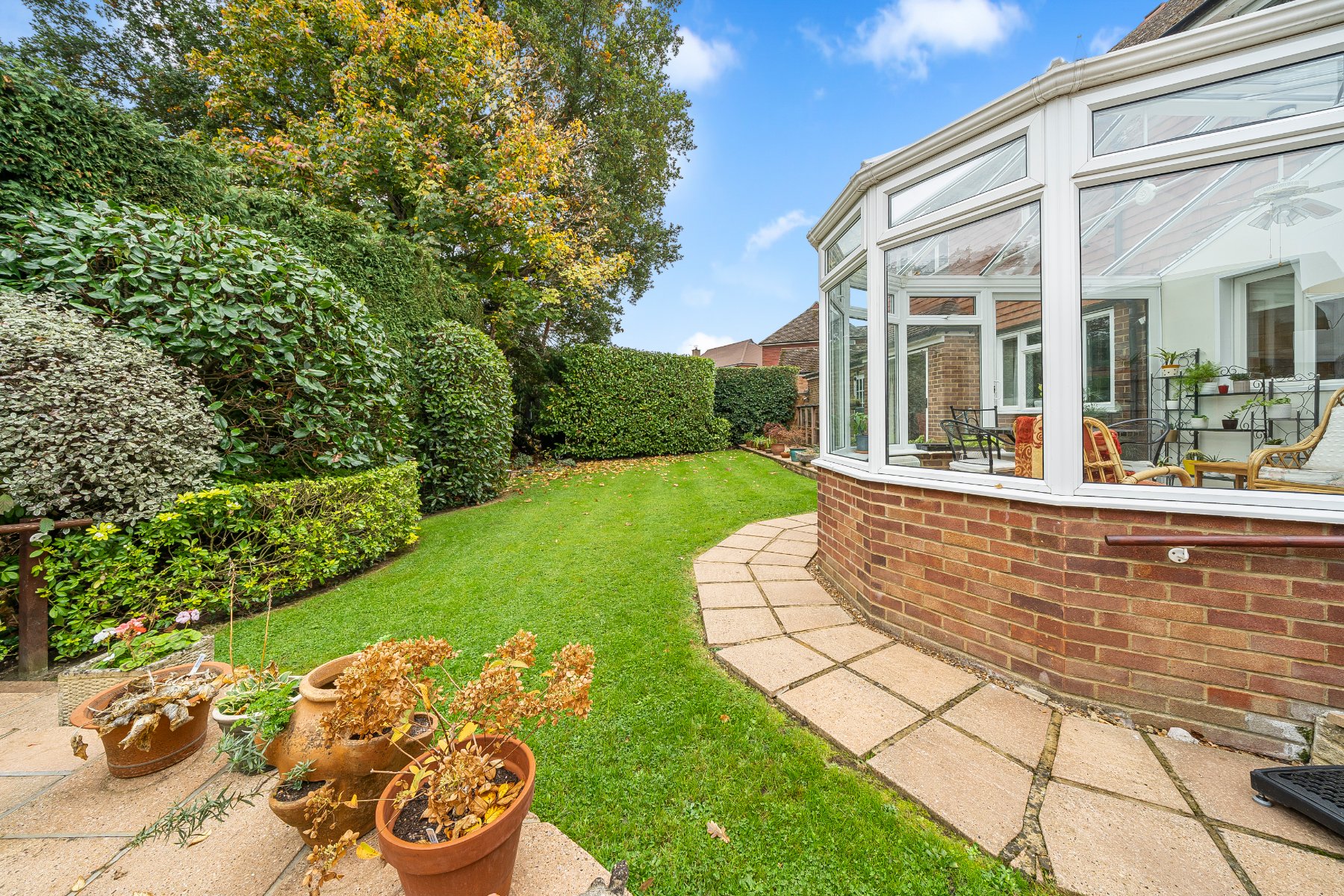 Nestled in the sought-after area of Merrow, this impressive four-bedroom home offers a rare combination of generous living space, thoughtful layout, and versatile accommodation. With driveway parking and a garage, it presents a welcoming façade and an abundance of room both inside and out, ideal for families or those seeking a home with flexibility and charm.The ground floor is beautifully arranged to maximise flow and functionality. The sitting room is a standout, featuring a characterful brick fireplace and sliding glass doors that open directly onto the garden, creating a seamless indoor-outdoor experience. The kitchen is both stylish and practical, with warm terracotta tiles, light wood shaker-style cabinetry, and crisp white countertops. A matching island anchors the space, which connects effortlessly to the conservatory and utility area. The conservatory itself is a sunlit retreat, perfect for morning coffee or evening relaxation, with direct access to the garden. Additional rooms on this level include a well-proportioned dining room and a separate study, offering ample space for entertaining, working from home, or unwinding in peace.Upstairs, the sense of space continues. All bedrooms are generously sized, with the principal bedroom enjoying the privacy of an en-suite shower room adorned with large tiled walls. The family bathroom is thoughtfully designed with a bathtub and overhead shower, complemented by a vanity unit and mirrored cupboards. A separate WC adjacent to the bathroom adds convenience and privacy for busy households.One of the most exceptional features of this property is the self-contained annexe on the first floor. Complete with its own kitchen, which mirrors the style and finish of the main kitchen, a cosy sitting room, and a bedroom with built-in storage, it offers a perfect solution for multi-generational living, or guest accommodation.Outside, the rear garden is a private haven. A spacious patio area to the left provides ample room for outdoor dining and entertaining, while the neat lawn is bordered by mature hedges and trees, ensuring privacy and a sense of tranquillity. A shed adds practical storage, rounding out the garden's appeal.