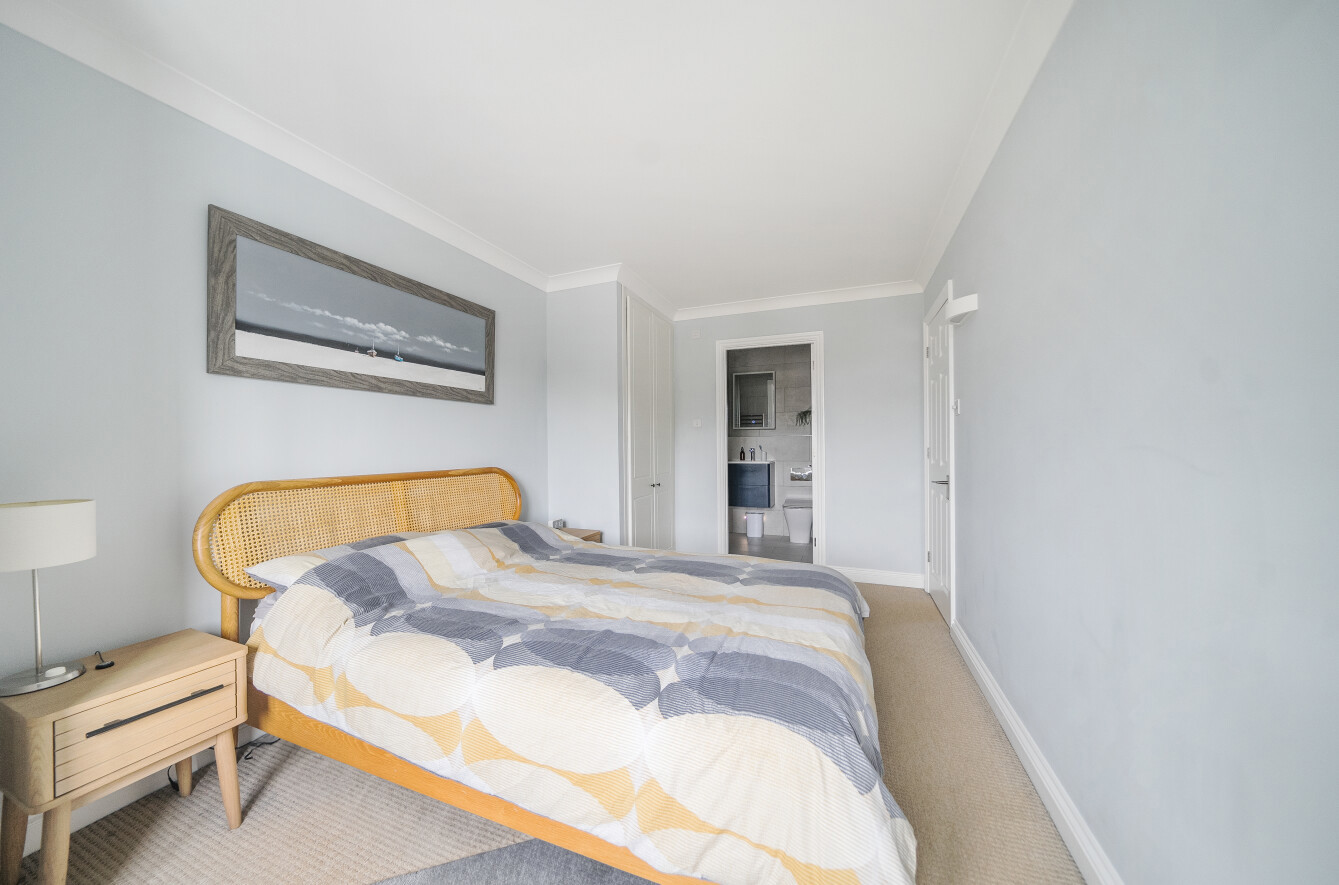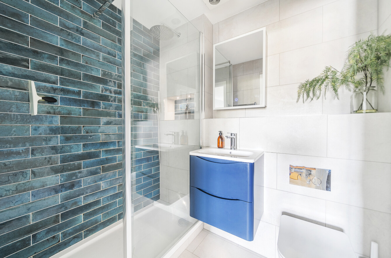 Across the hallway an exceptional main bedroom echoes the superior levels of presentation and comes complete with a wealth of fitted wardrobes. Providing the perfect finishing touch, its en suite has a glass framed walk-in shower set against the sultry sheen of rich teal blue brick tiles. A floating basin console adds a further pop of colour.