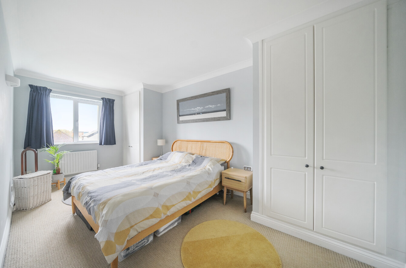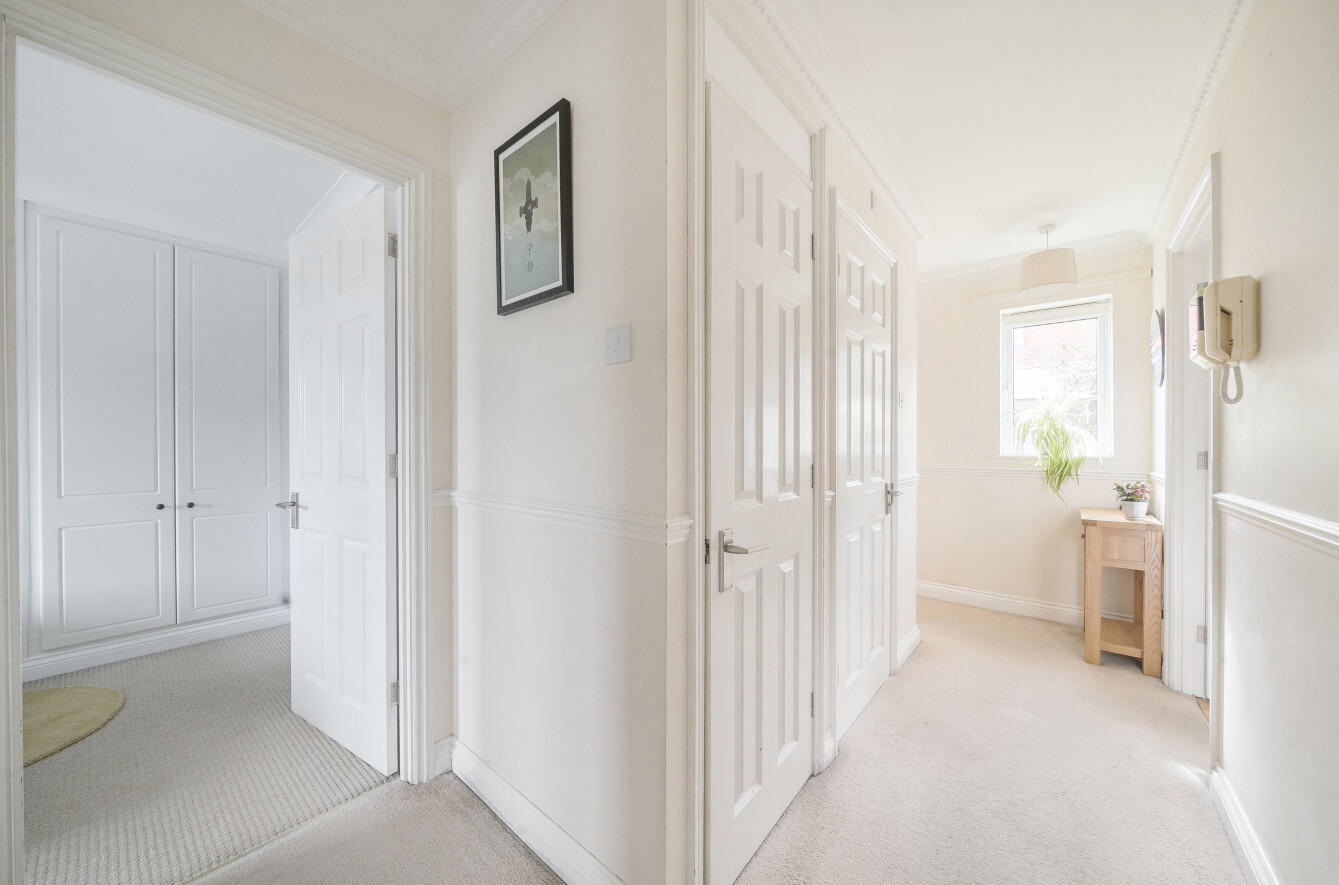 Versatile to your needs the adjacent large single bedroom is styled with heritage sage green hues and is currently used as refined home office. A second shower room matches the specification of the en suite and has the geometric patterns of a feature floor, while a duo of hallway cupboards help to keep things clutter-free.