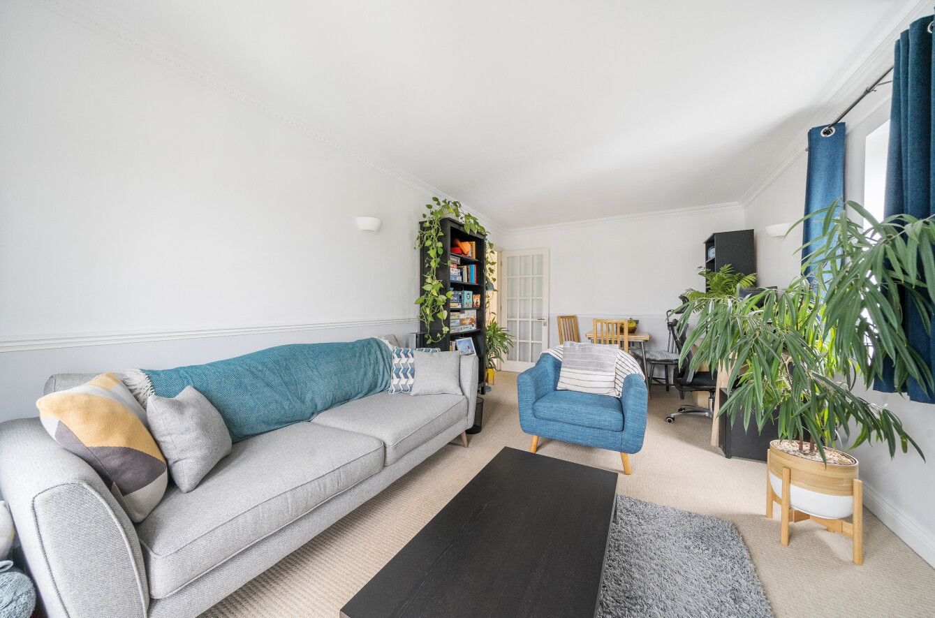 With French doors opening onto a Juliet balcony a superbly sized double aspect reception room is beautifully filled with natural light and has dimensions that make it easy to create dedicated seating and dining spaces. The trees outside add a leafy backdrop while dado rails and cornicing lend a classic contrast to a subtle blue colour scheme that gives a hugely calm and restful feel.