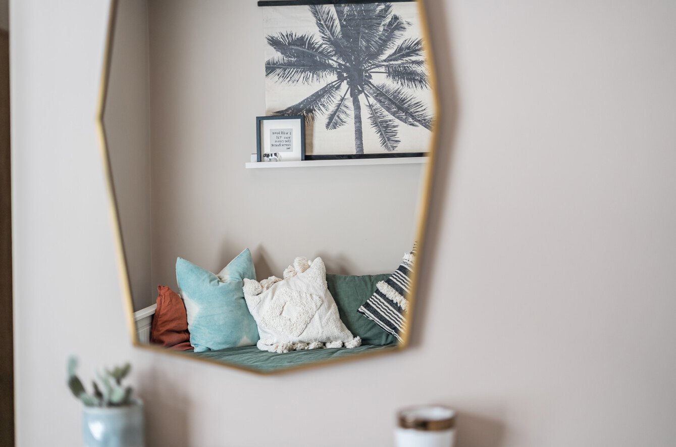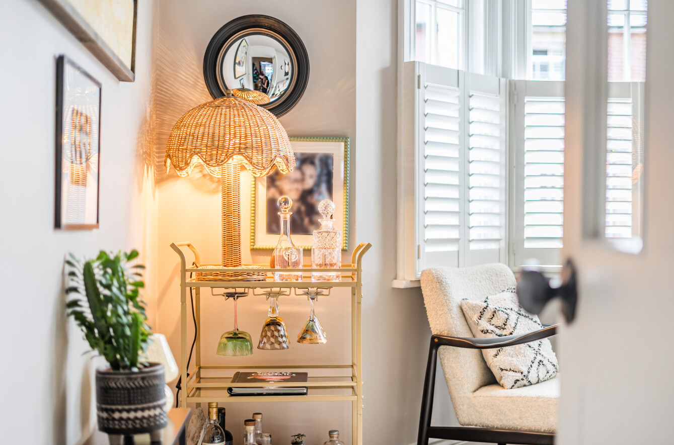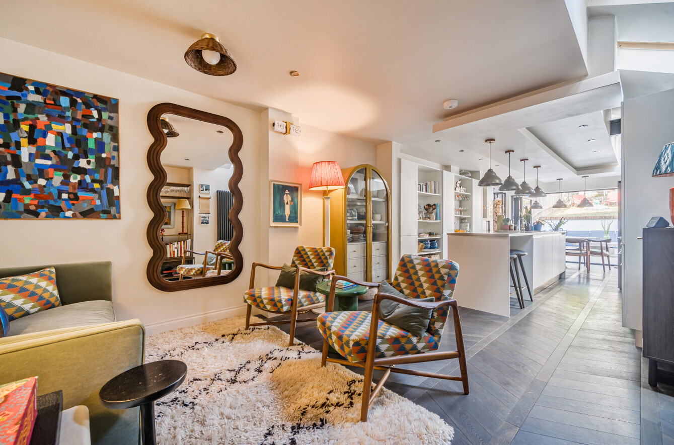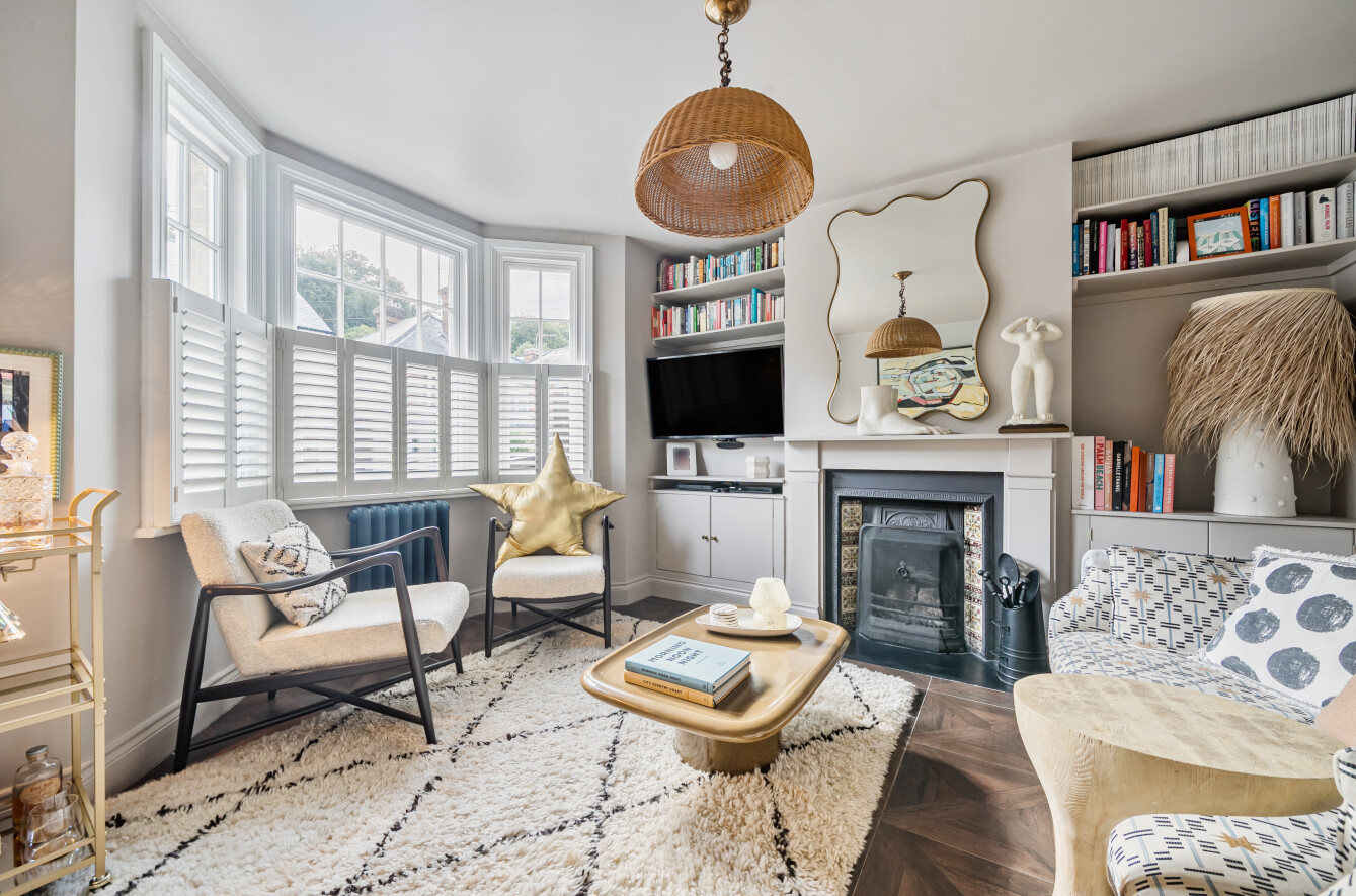 - Bay-fronted sitting room with feature fireplace and bespoke cabinetry