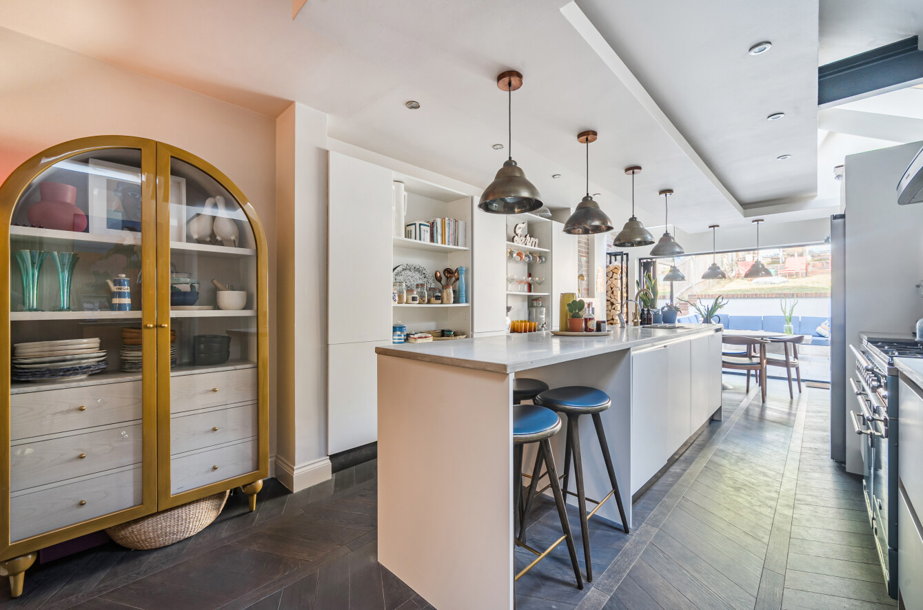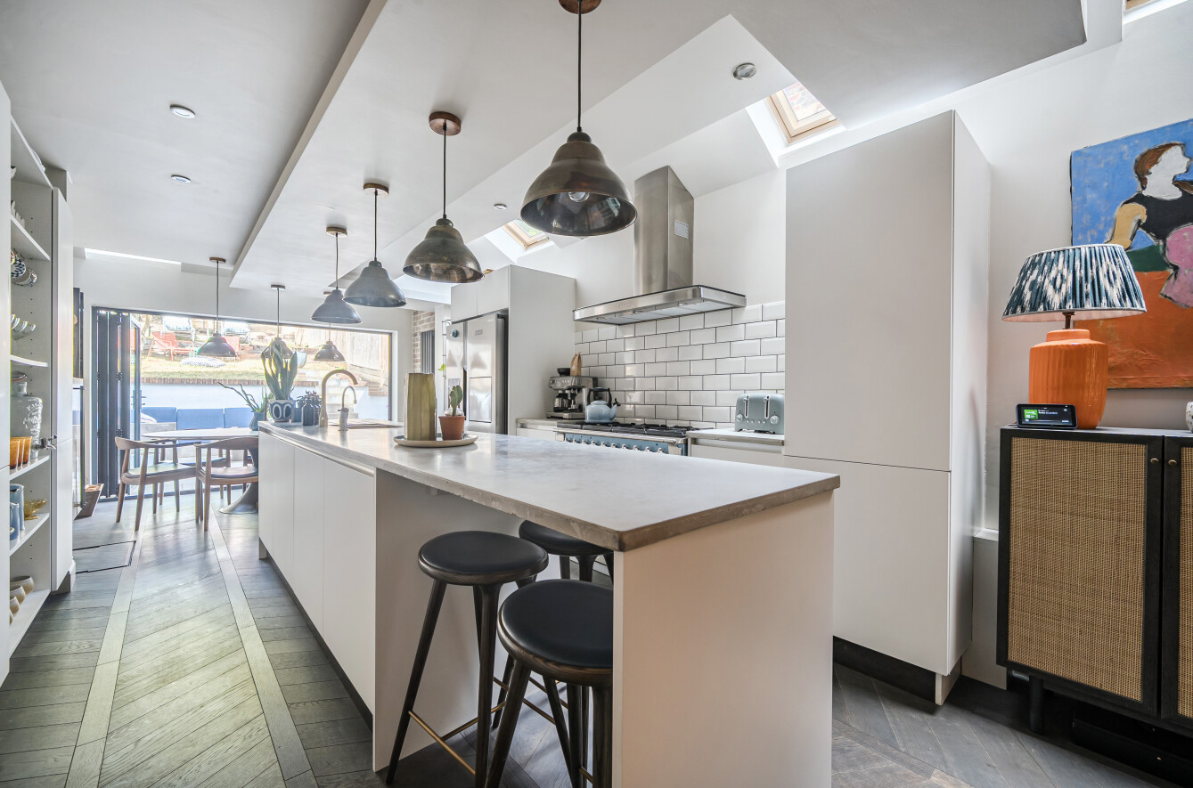 - Striking kitchen/dining/family room with central island and bi-fold doors