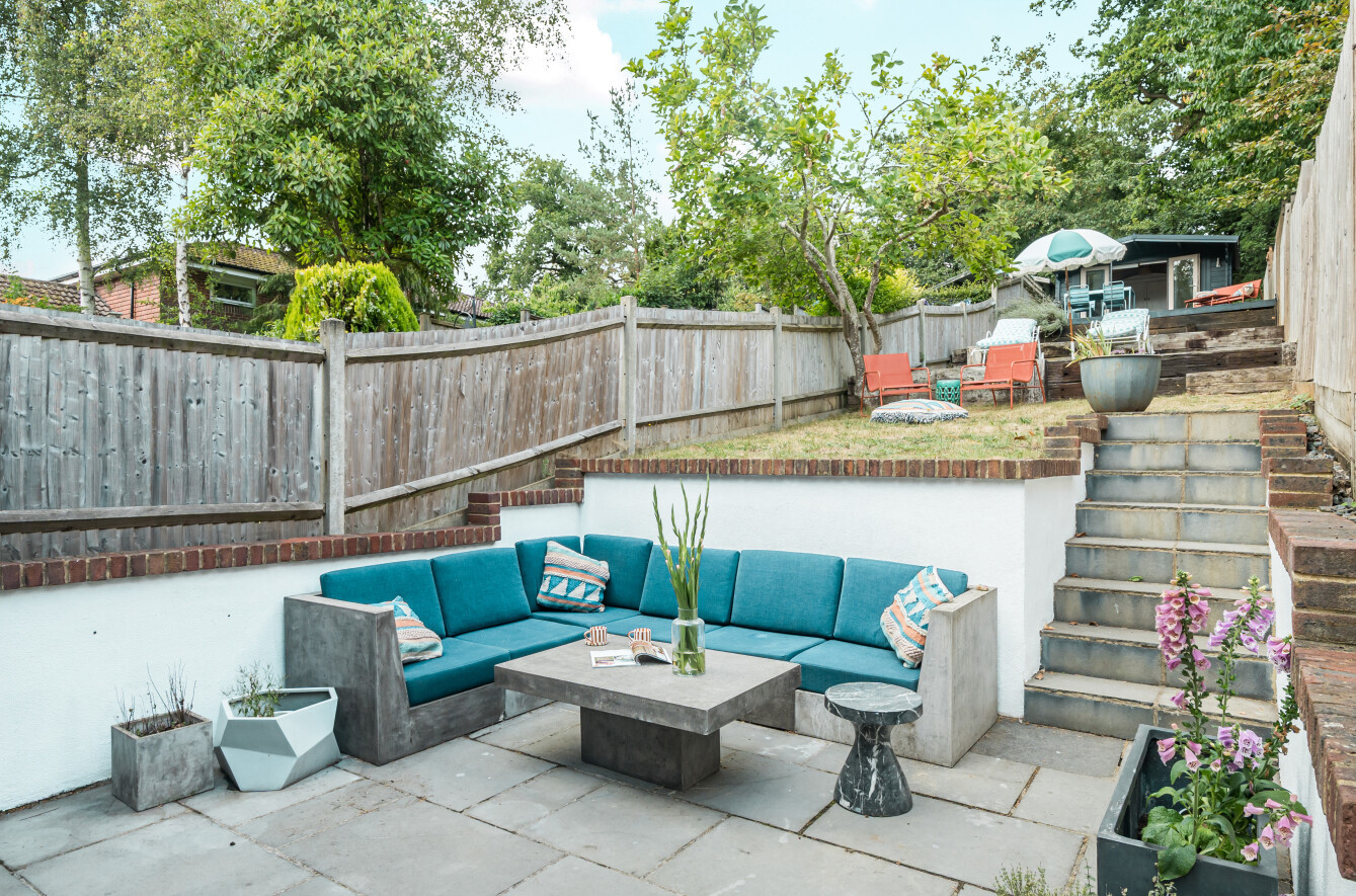 - Landscaped tiered gardens with sunken terrace, lawn, decked seating area, and garden studio