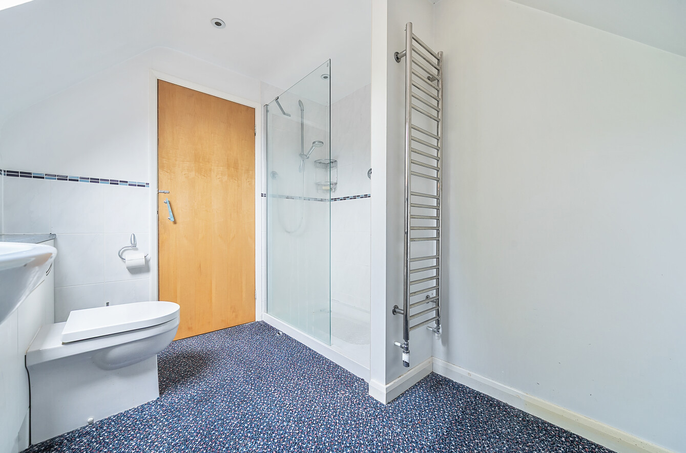 Beautifully lit and finished with carved banisters that match the warming tones of the parquet, a solid wood staircase rises gently to the first floor where two double bedrooms stretch out beneath high sloping ceilings with skylights that let you stargaze from the comfort of your own bed. An excellently sized principal bedroom has plenty of storage within tastefully chosen fitted wardrobes, while the equally notable second bedroom has a split-level layout that gives delineated space for a desk/study area. Together they share a stylish shower room with a clean modern aesthetic and feature mosaics that lend a subtle dash of colour.