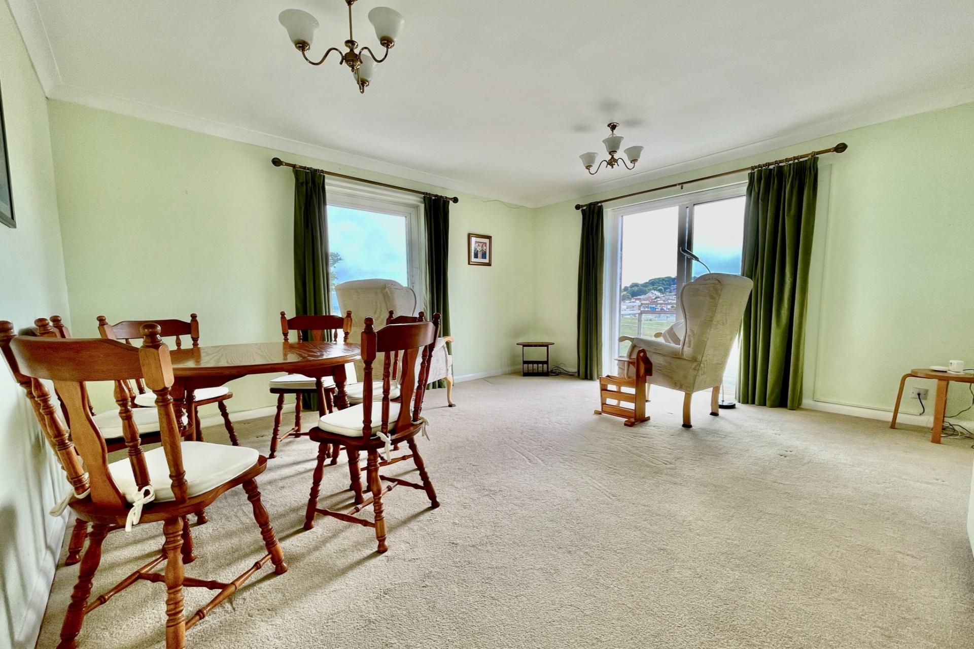 The entrance hall welcomes you to this top floor apartment and leads through to the dual aspect living room with sliding doors to the South facing glazed balcony; enjoying fine views across adjacent recreation grounds to Swanage Bay and Peveril Point. The kitchen has a range of coloured units, matching worktops and has ample room for a dining table and chairs.
