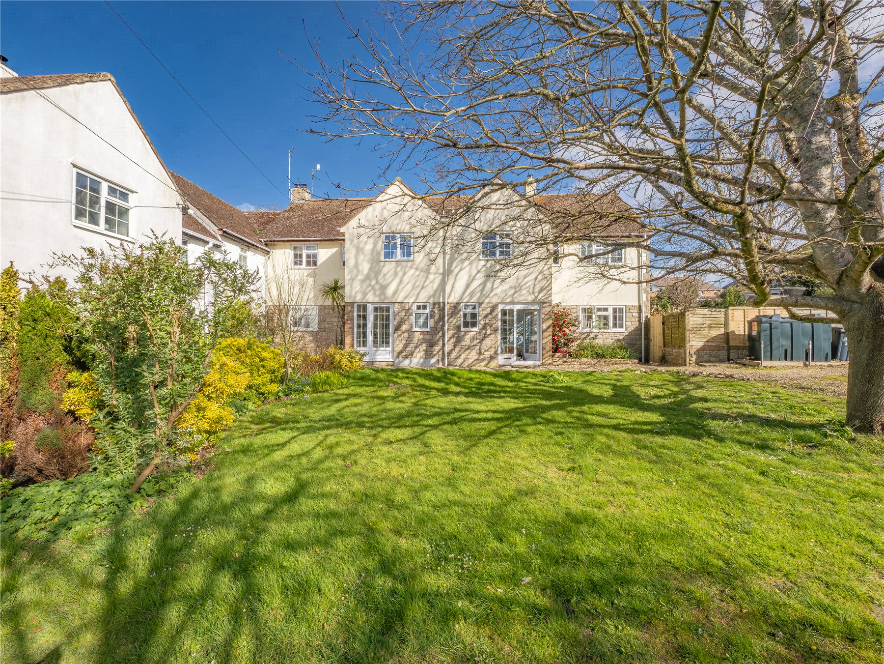 Walking up the sunny front garden to the double front doors, you step into the spacious ENTRANCE HALL, from which all rooms lead. To your right is the SITTING ROOM, a particularly generously sized room with a large bay window, which floods the room with sunlight. An open fireplace makes this the perfect spot to curl up on a winters evening.