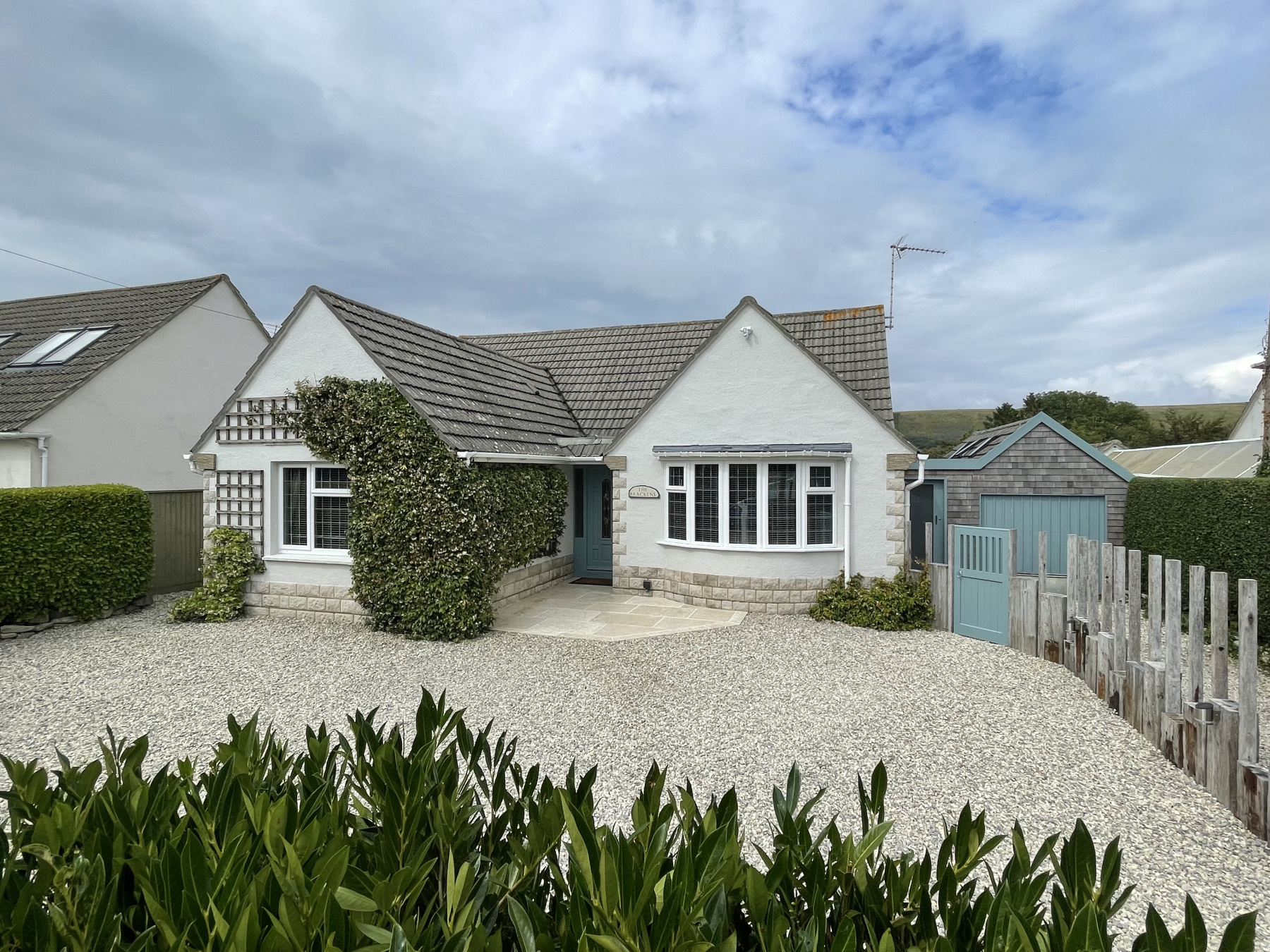 This well-loved home is set back from Harmans Cross on the quiet lane known as North Instow. Travelling out of North Instow and turning right, just past the garage is the crossroads. On the right is Tabbits Hill lane, which leads to the footpaths up onto Nine Barrow Down, with its spectacular views and routes to Swanage or Corfe along the top.
