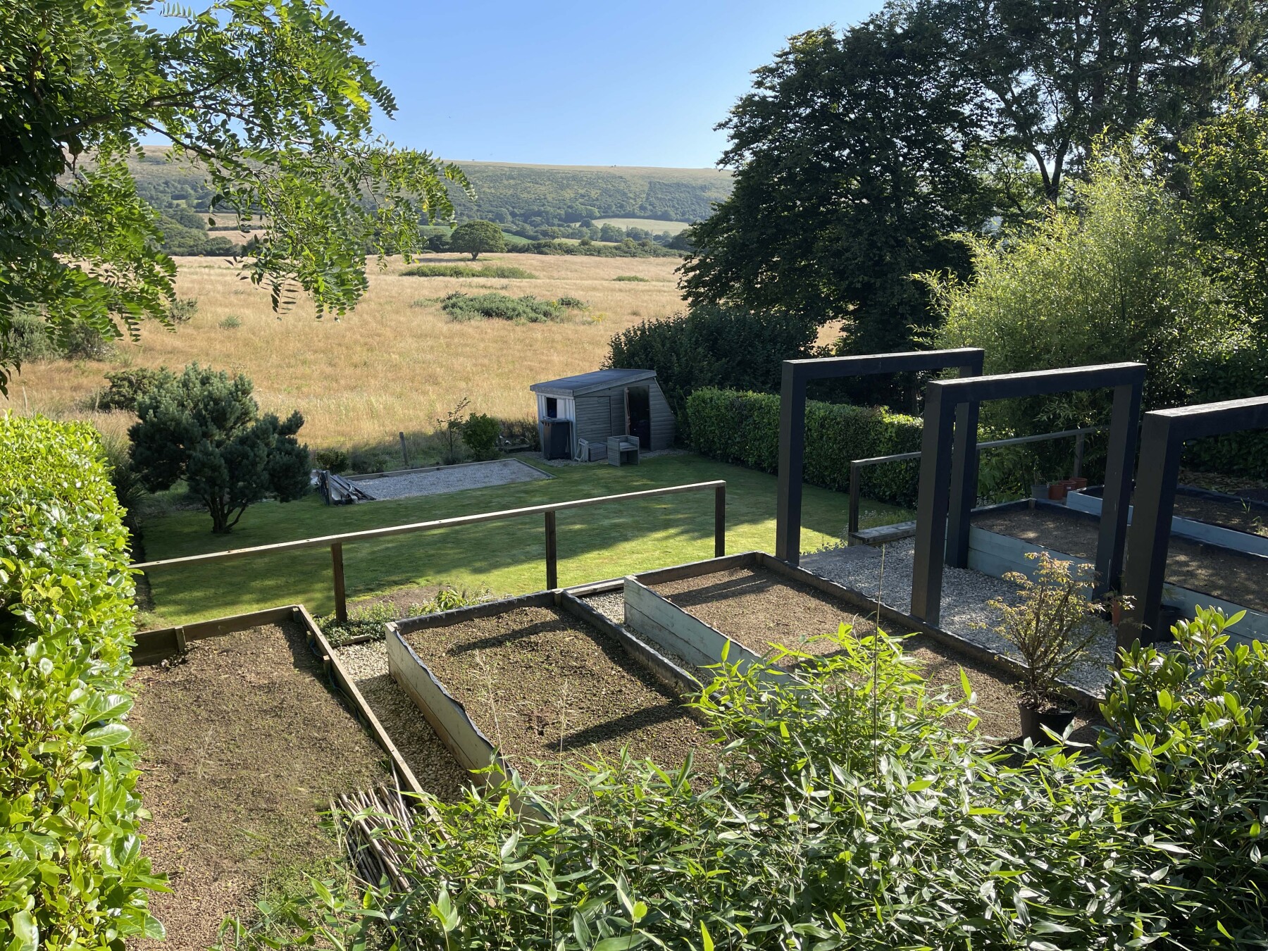 A few further steps down take you under a pergola and into the KITCHEN GARDEN beautifully laid out with raised beds to grow vegetables or cut flowers for the house. Beyond this is yet another SECRET GARDEN garden laid to lawn, with a further shed to stow away chairs and garden paraphernalia. Here a small stye allows you to roam out across open countryside as far as the beaches.