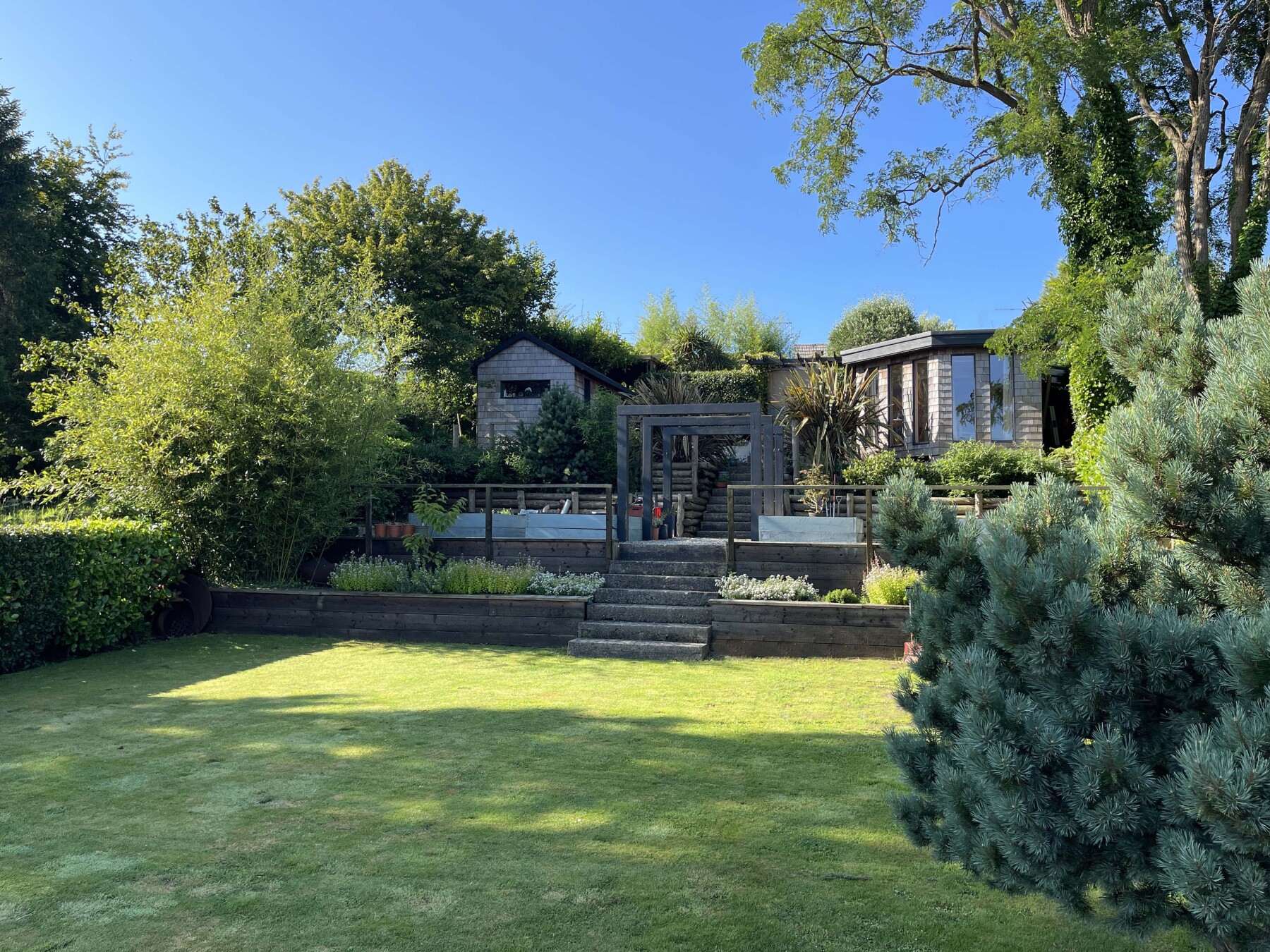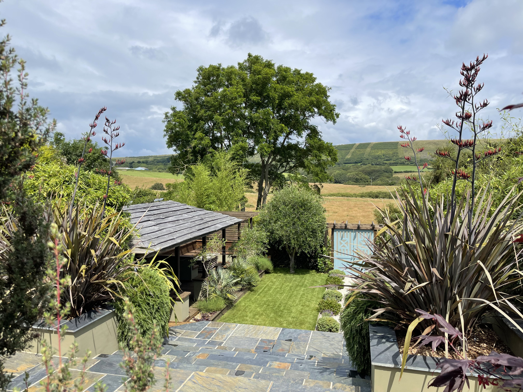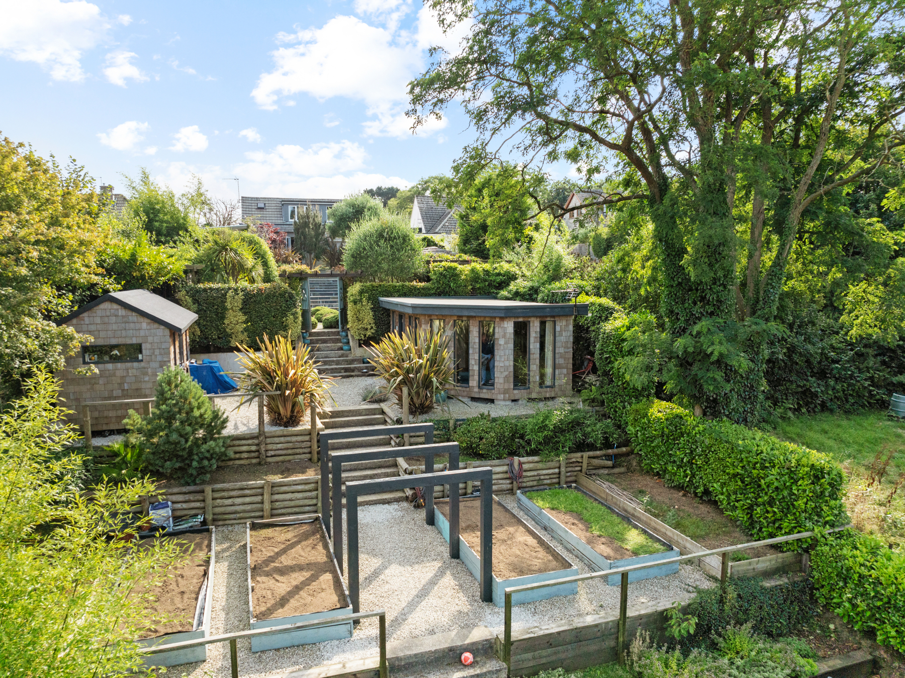 Spectacular terraced gardens with outdoor kitchen, garden rooms and access to open countryside
