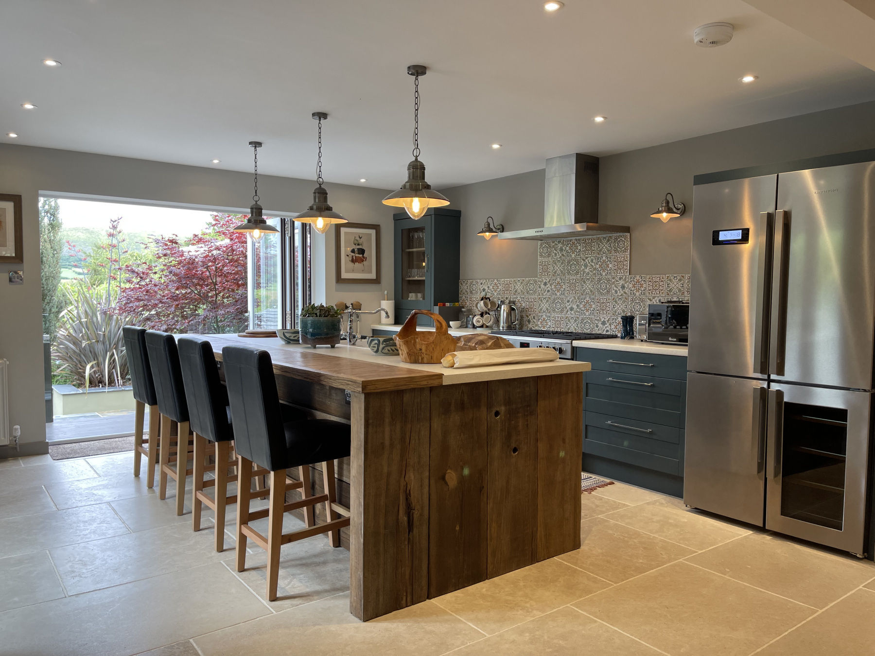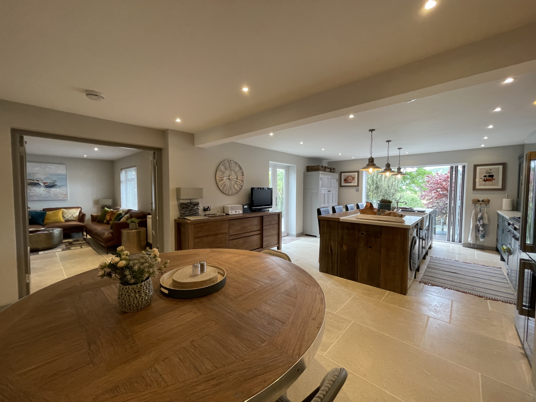 The hallway then opens onto the spacious and stylish KITCHEN/DINING ROOM with plenty of space to house a large table which comfortably sits 8, and a magnificent Island breakfast bar which is undoubtedly the heart of this home (before you step outside!). It is fitted with everything you might expect from a high specification kitchen, including an American Fridge and gas range cooker. The eye is drawn to large, glazed door on two sides opening onto the magnificent, terraced gardens. Double doors open into the spacious SITTING ROOM. Windows look out to a sunny patio the first of many outdoor eating areas. A beautiful bright room, but equally a cosy room to snuggle up in on a winters evening.