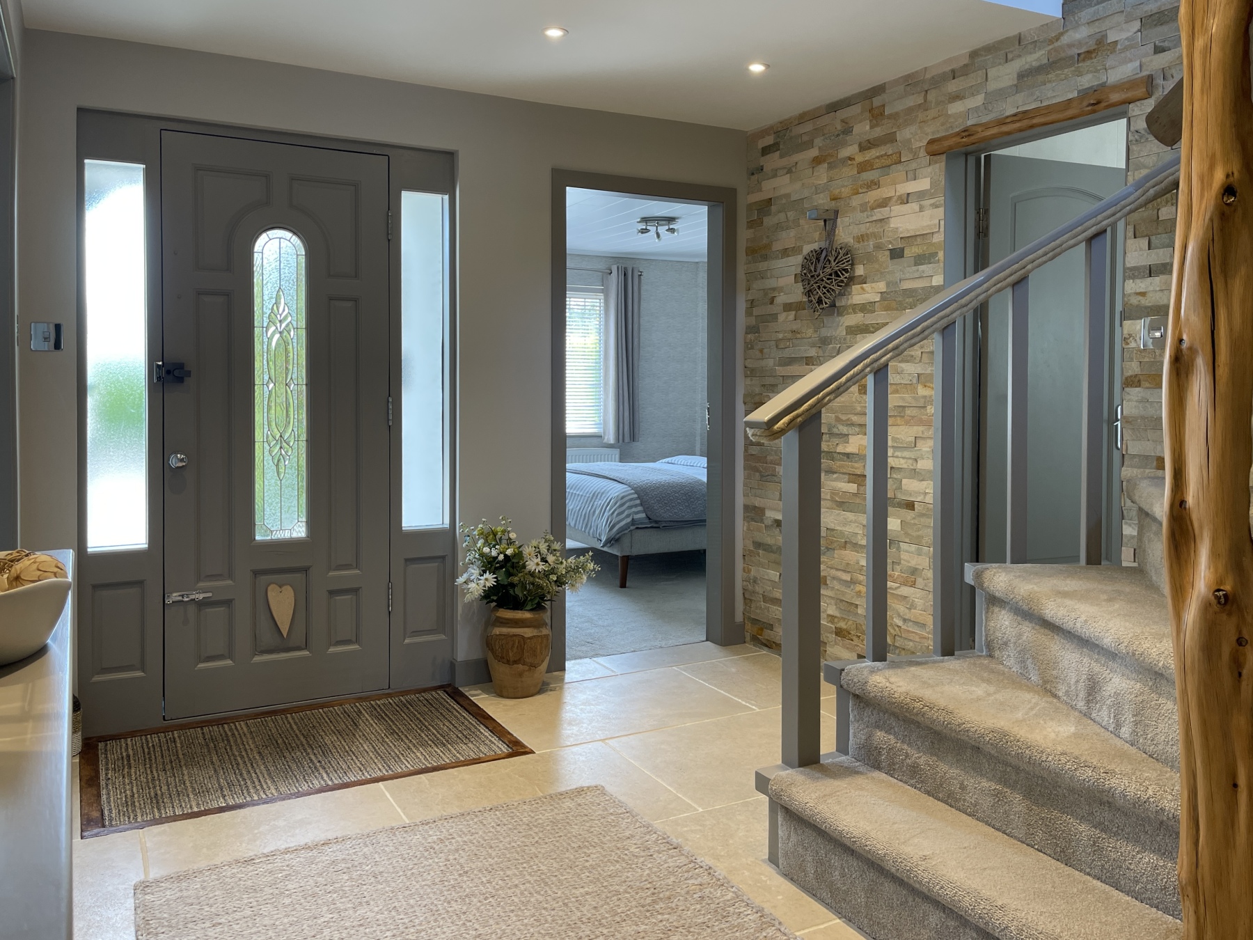 Approaching the house from the private lane there is the option to park opposite the house in a space that can accommodate four or more cars, or on the spacious frontage parking attached to the house. Step in through the front door, to a generous HALLWAY, with a feature stone wall, and stairs leading to upper bedrooms.
