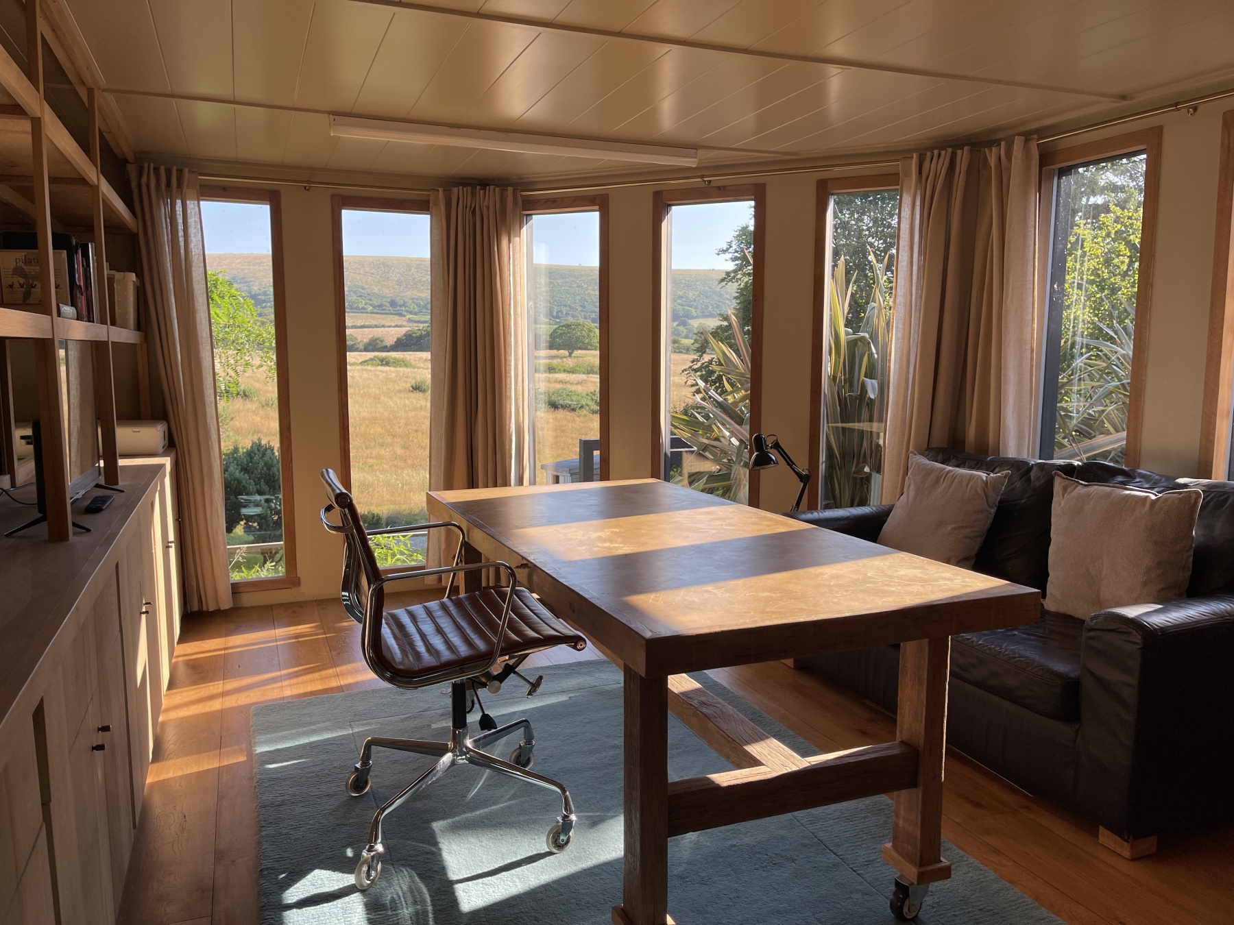 Stepping down to a the ZEN GARDEN which is a perfect spot to escape to work or curl up with a book. To the left is a stylish WORKSHOP which others might use as a garden snug with glazed doors looking across grass and planting. Opposite is the magnificent GARDEN OFFICE with ensuite and floor to ceiling windows offering spectacular views across Purbeck.