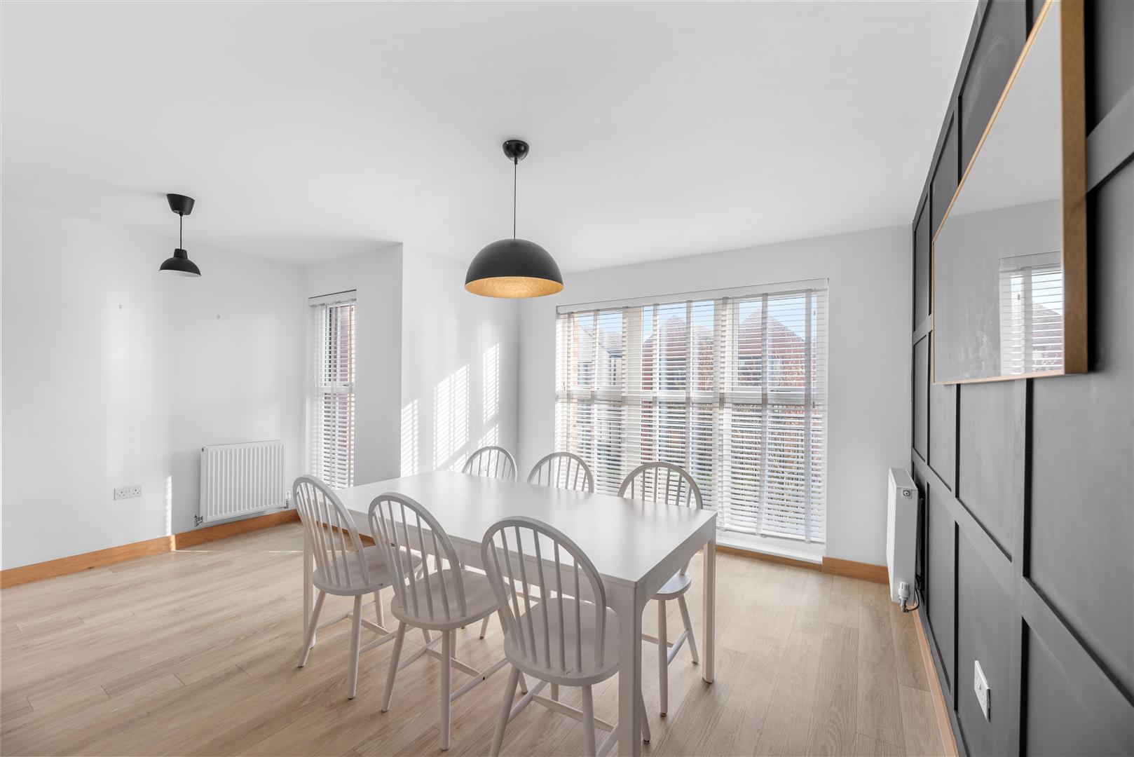 Dining Room - 4.79 x 4.11 (15'8" x 13'5") - A bright, well-proportioned dining space with large windows fitted with white blinds, allowing plenty of natural light. Light oak flooring & woodwork contrast beautifully with the crisp white walls, complemented by contemporary pendant lighting and a striking panelled feature wall.