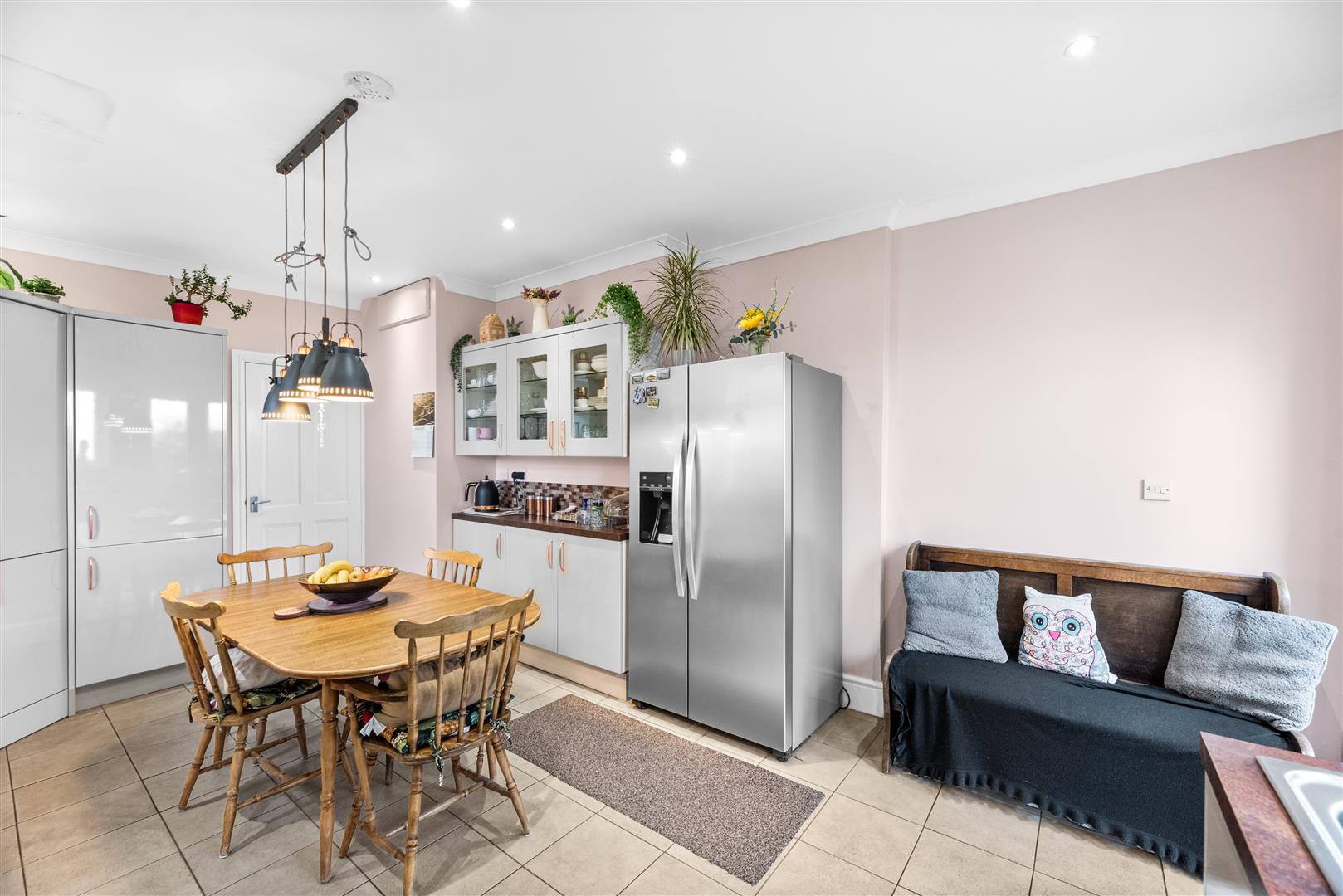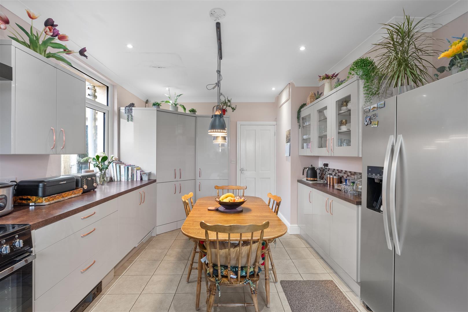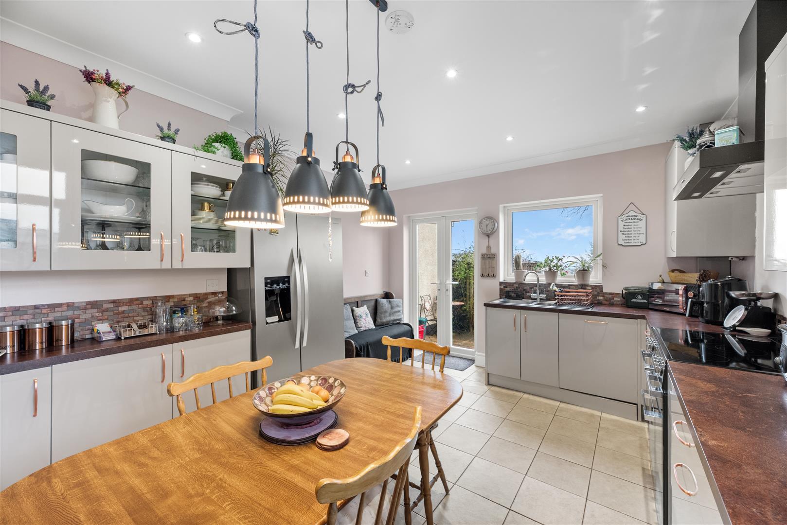 Kitchen/Dining Room - 5.53 x 3.77 (18'1" x 12'4") - A contemporary kitchen diner fitted with sleek soft-grey units, complemented by warm rust-toned worktops and rose gold handles for a subtle designer touch. Integrated appliances include a dishwasher, washing machine, Flavel cooker and extractor, while a substantial pantry cupboard provides excellent additional storage. A practical yet inviting space, ideal for everyday living and entertaining. Space for a central dining table with pendant lighting above. Pvcu windows and patio doors to the garden.