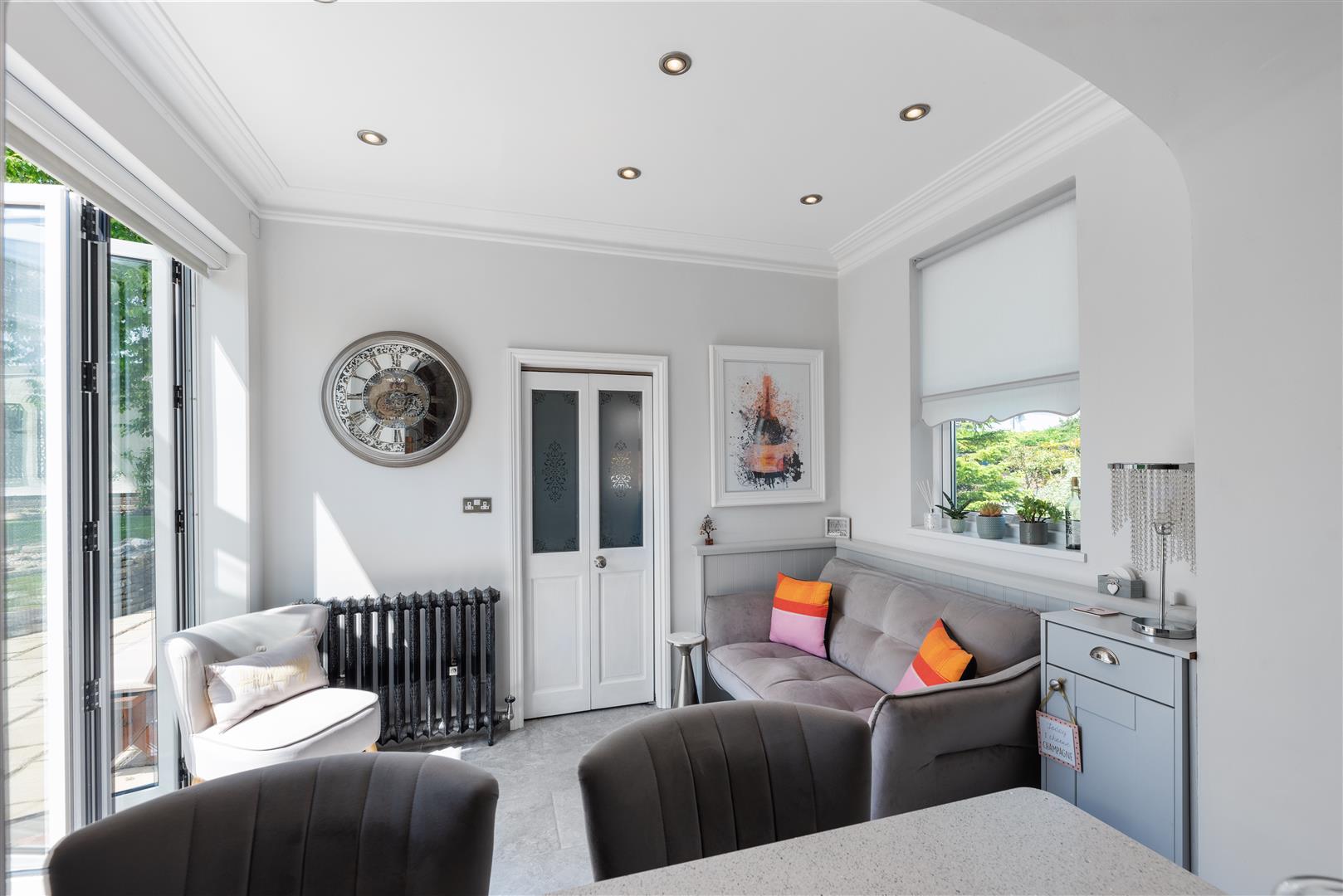 Dining Room - 6.72 x 3.51 (22'0" x 11'6") - Expansive dining room featuring reclaimed oak flooring, elegant ceiling rose & coving, pvcu bay windows with shutters and logburner with sleeper surround. A bespoke cocktail bar, finished in dark grey with vintage mirrors and atmospheric lighting, brings an instant vibe, effortlessly stylish and made for entertaining.