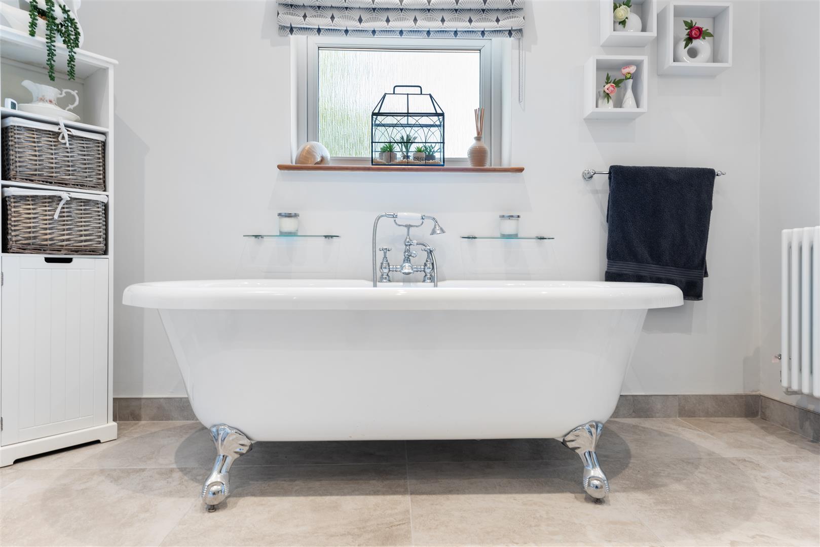 Bathroom - 3.37 x 3.18 (11'0" x 10'5") - This stunning bathroom blends classic style with modern comfort, featuring a luxurious double walk-in shower, elegant freestanding claw foot tub, sink with built-in storage, heated towel rail and WC. Spacious and beautifully designed, it's ideal as a family bathroom, offering both function and indulgence for daily routines.