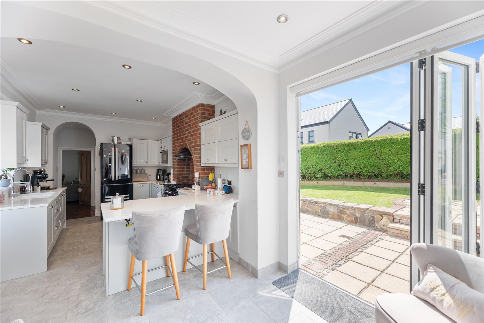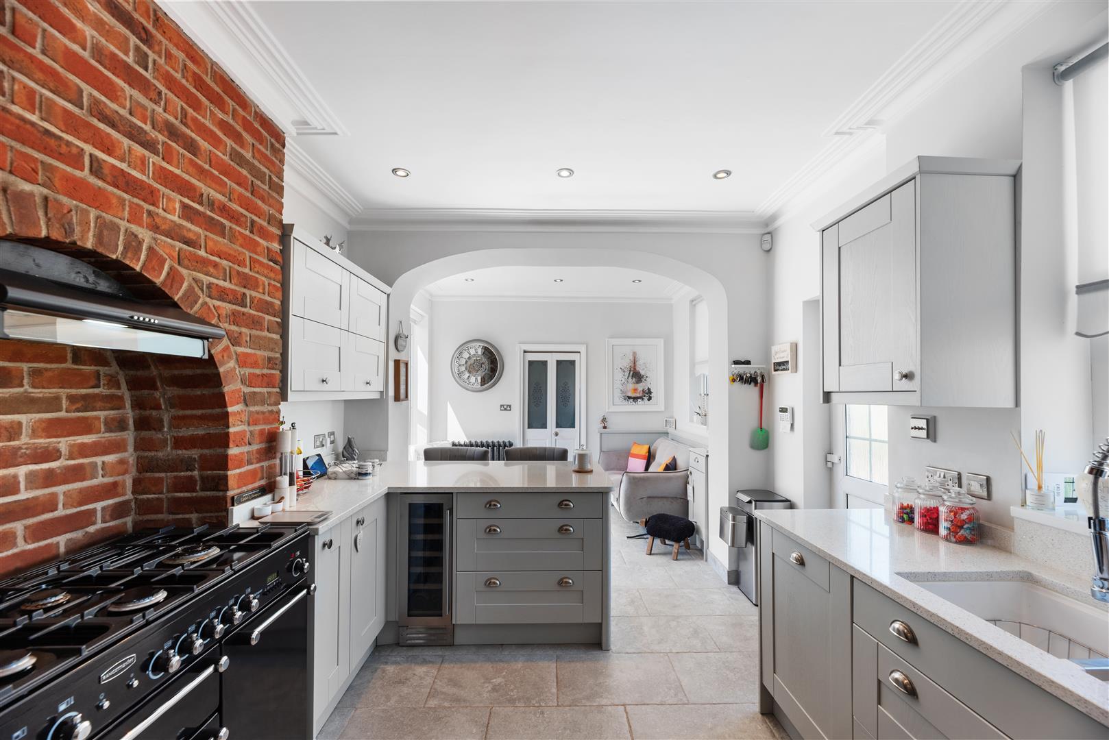 Kitchen/Dining Room - 7.19 x 3.01 (23'7" x 9'10") - This stylish kitchen diner features units in a soft grey palette, with quartz worktop & breakfast bar, integral dishwasher, wine cooler and a statement Rangemaster cooker framed by a charming red brick surround. With a relaxed seating area opening onto the rear garden through patio doors, it's perfectly designed for modern family life and effortless indoor-outdoor living. Also with recessed spotlights, tiled flooring, gorgeous Victorian radiator and further doors to the utility space, walk-in understairs closet and the side entrance.
