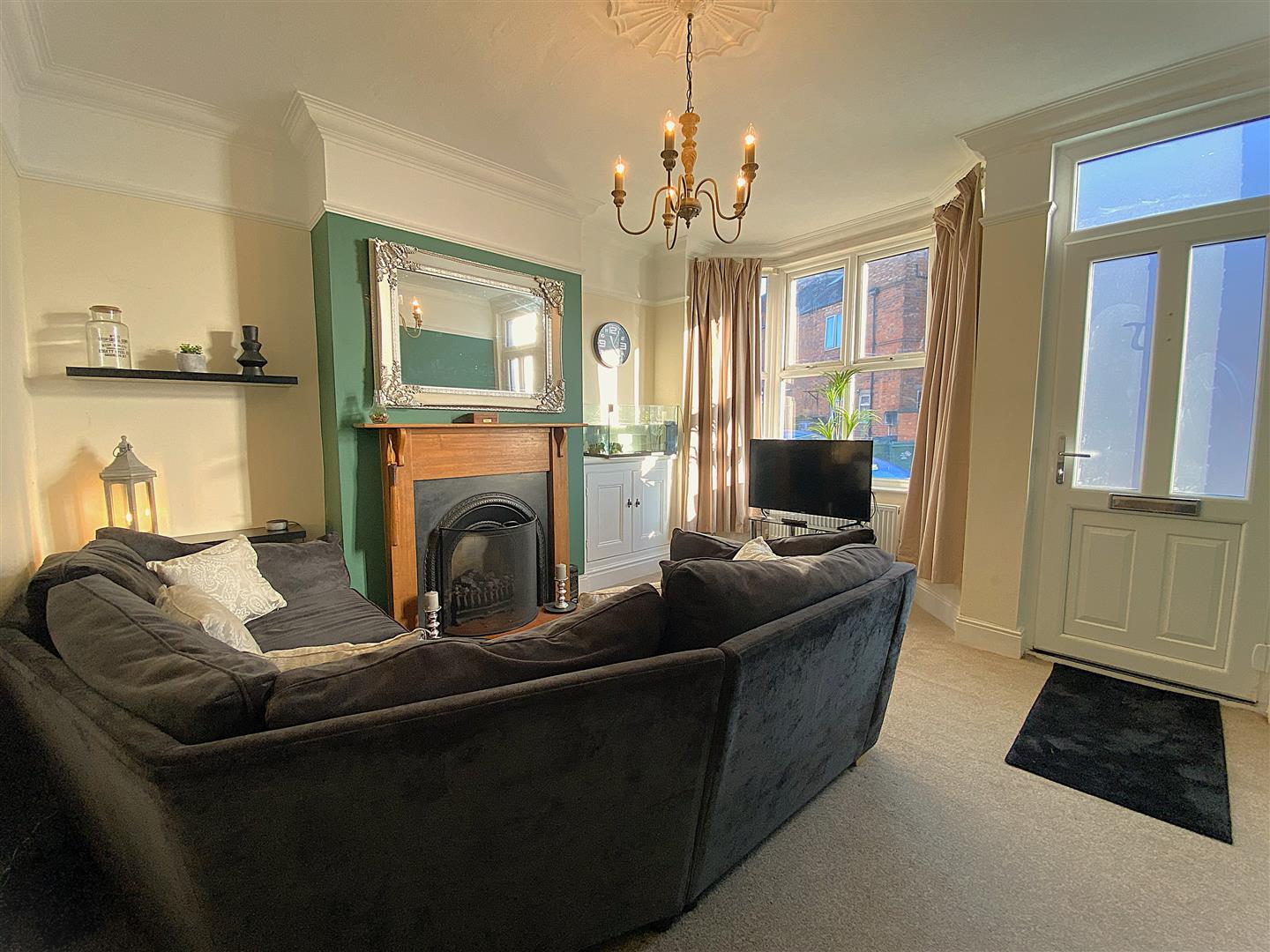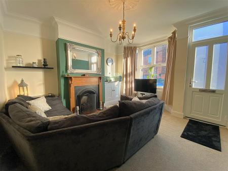 Lounge - 4.27 x 3.74 (14'0" x 12'3") - With bay window to the front coved ceiling, ceiling rose and chandelier, picture rail, gas fire with feature surround.