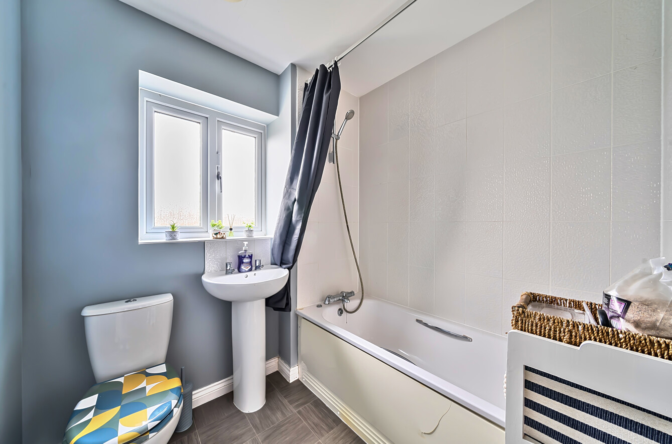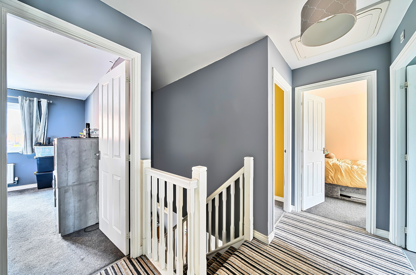 A staircase from the hall leads to a spacious landing with loft access and an airing cupboard, and provides access to the four double bedrooms. The principal bedroom has a mirror-fronted double width wardrobe and an en suite shower room comprising a wall-mounted shower within a double-width enclosure, pedestal wash basin, low-level WC and extractor fan. The family bathroom is has a panelled bath with shower attachment over, pedestal wash basin, low-level WC, extractor fan and an opaque double-glazed window.