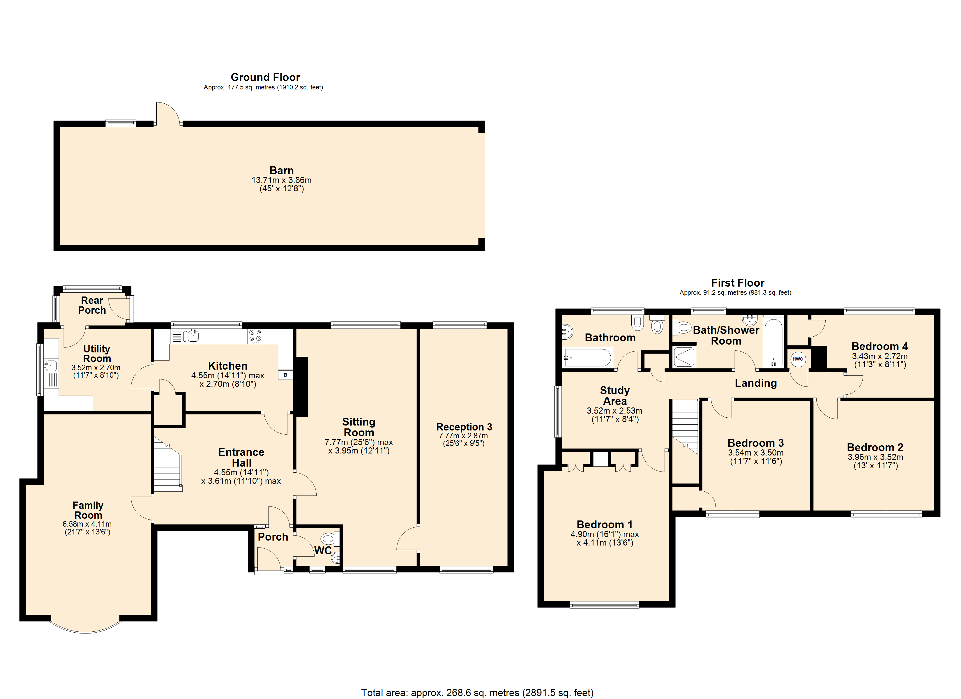 Upstairs, a generous landing provides an ideal study or reading area and leads to four well-proportioned double bedrooms, all benefiting from pleasant outlooks. This level is further complemented by the convenience of two family bathrooms.